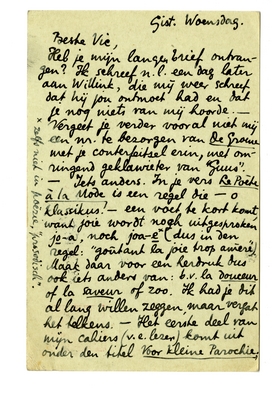 Heb je mijn langen brief ontvangen? Ik schreef n.l. een dag later aan Willink1028, die mij weer schreef dat hij jou ontmoet had en dat je nog niets van mij hoorde. - Vergeet je verder vooral niet mij een nr. te bezorgen van De Groene met je conterfeitsel erin, met omringend geklawieter van ‘Guus’1029. - Iets anders. In je vers Le Poète à la Mode is een regel die - o klassikus! - een voet te kort komt, want joie wordt noch uitgesproken jo-a, noch joa-e* (dus in den regel: ‘goûtant la joie trop amère’). Maak daar voor een herdruk dus ook iets anders van: b.v. la douceur of la saveur of zoo1030. Ik had je dit al lang willen zeggen, maar vergat het telkens. - Het eerste deel van mijn cahiers (v.e. lezer) komt uit onder den titel Voor kleine Parochie; vind je dat in orde? Voor het 2e dl. dat nog niet klaar is, dacht ik te nemen, als titel, Vriend of Vijand. Wat vind je dáárvan? (Of vind je Hand en (of) Vuist beter? Er is natuurlijk ook nog heel wat anders te vinden.) - Ik durf nog steeds niet beginnen aan Clementine1031. Het is hier anders heerlijk rustig en de zon is zoo gul als het maar kan. Nu, beste, tot nader. Denk om de desiderata!!! - Steeds van harte je