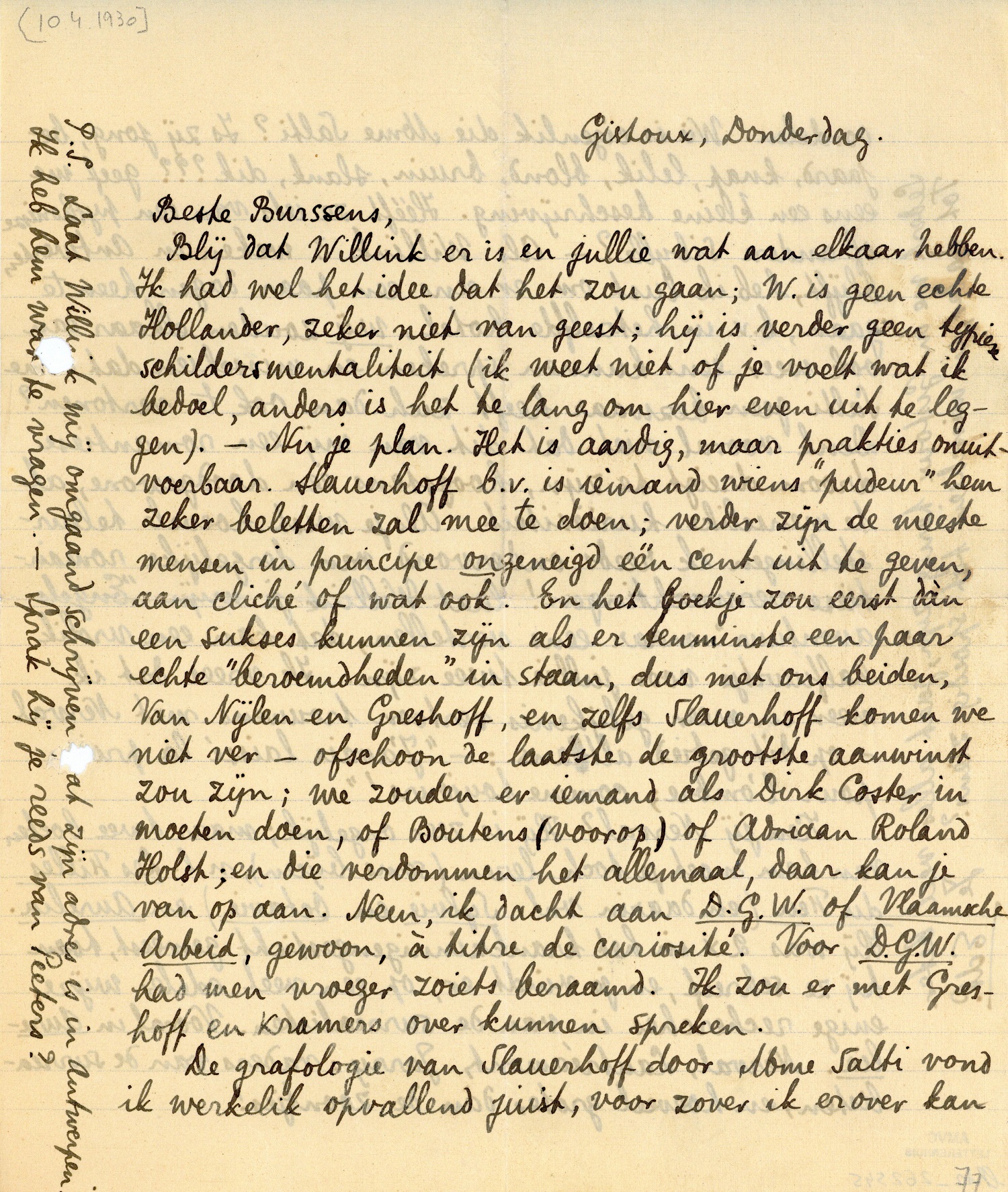 Blij dat Willink er is en jullie wat aan elkaar hebben. Ik had wel het idee dat het zou gaan; W. is geen echte Hollander, zeker niet van geest; hij is verder geen typiese schildersmentaliteit (ik weet niet of je voelt wat ik bedoel, anders is het te lang om hier even uit te leggen). - Nu je plan1032. Het is aardig, maar prakties onuitvoerbaar. Slauerhoff b.v. is iemand wiens ‘pudeur’ hem zeker beletten zal mee te doen; verder zijn de meeste mensen in principe ongeneigd één cent uit te geven, aan cliché of wat ook. En het boekje zou eerst dàn een sukses kunnen zijn als er tenminste een paar echte ‘beroemdhe-den’ in staan, dus met ons beiden, Van Nijlen en Greshoff, en zelfs Slauerhoff komen we niet ver - ofschoon de laatste de grootste aanwinst zou zijn; we zouden er iemand als Dirk Coster in moeten doen, of Boutens (voorop) of Adriaan Roland Holst; en die verdommen het allemaal, daar kan je van op aan. Neen, ik dacht aan D.G.W. of Vlaamsche Arbeid, gewoon, à titre de curiosité. Voor D.G.W. had men vroeger zoiets beraamd. Ik zou er met Greshoff en Kramers over kunnen spreken.