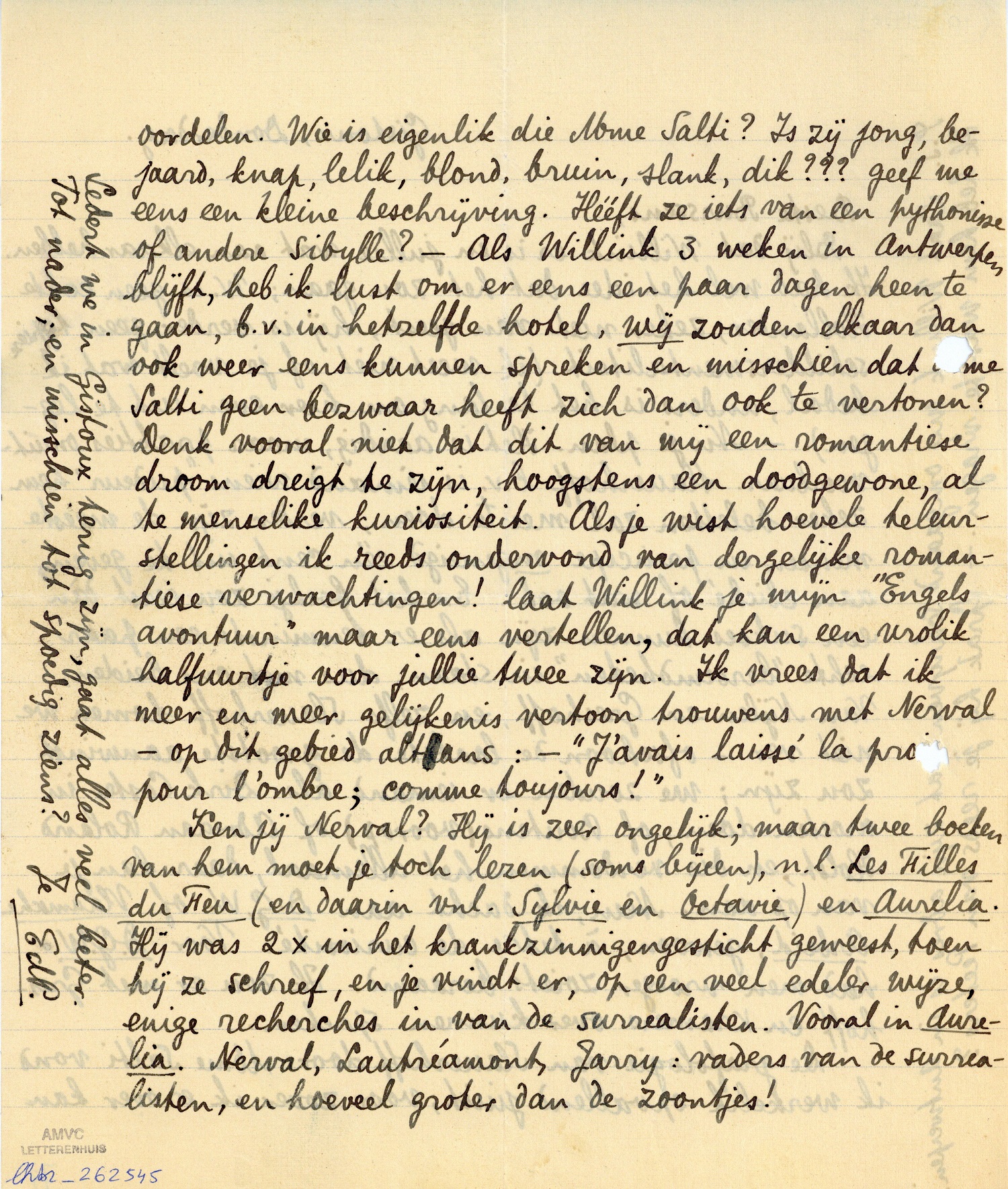 De grafologie van Slauerhoff door Mme Salti vond ik werkelik opvallend juist, voor zover ik er over kan oordelen. Wie is eigenlik die Mme Salti? is zij jong, bejaard, knap, lelik, blond, bruin, slank, dik??? geef me eens een kleine beschrijving. Hééft ze iets van een pythonisse of andere Sibylle? - Als Willink 3 weken in Antwerpen blijft, heb ik lust om er eens een paar dagen heen te gaan, b.v. in hetzelfde hotel, wij zouden elkaar dan ook weer eens kunnen spreken en misschien dat Mme Salti geen bezwaar heeft zich dan ook te vertonen? Denk vooral niet dat dit van mij een romantiese droom dreigt te zijn, hoogstens een doodgewone, al te menselike kuriositeit. Als je wist hoevele teleurstellingen ik reeds ondervond van dergelijke romantiese verwachtingen! laat Willink je mijn ‘Engels avontuur’1033 maar eens vertellen, dat kan een vrolik halfuurtje voor jullie twee zijn. Ik vrees dat ik meer en meer gelijkenis vertoon trouwens met Nerval - op dit gebied altans: - ‘J'avais laissé la proie pour l'ombre; comme toujours!’