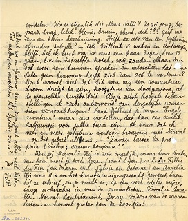 Ken jij Nerval? Hij is zeer ongelijk; maar twee boeken van hem moet je toch lezen (soms bijeen), n.l. Les Filles du Feu (en daarin vnl. Sylvie en Octavie) en Aurelia. Hij was 2× in het krankzinnigengesticht geweest toen hij ze schreef, en je vindt er, op een veel edeler wijze, enige recherches in van de surrealisten. Vooral in Aurelia. Nerval, Lautréamont, Jarry: vaders van de surrealisten, en hoeveel groter dan de zoontjes!