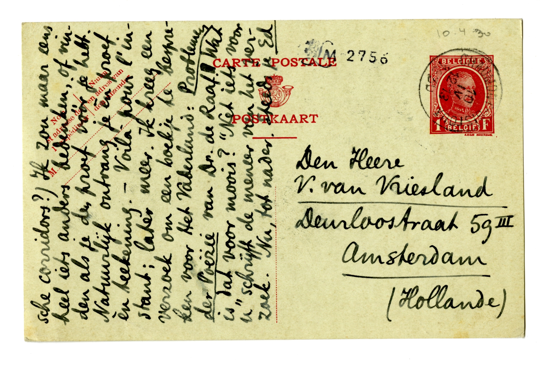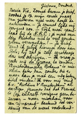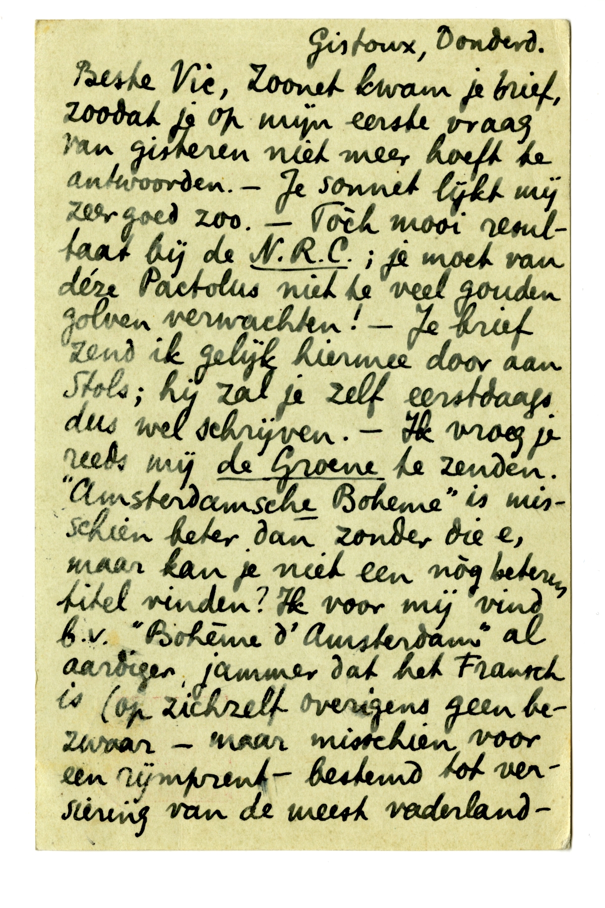 Beste Vic, Zoonet kwam je brief, zoodat je op mijn eerste vraag van gisteren niet meer hoeft te antwoorden. - Je sonnet lijkt mij zeer goed zoo. - Tòch mooi resultaat bij de N.R.C.; je moet van déze Pactolus niet te veel gouden golven verwachten! - Je brief zend ik gelijk hiermee door aan Stols; hij zal je zelf eerstdaags dus wel schrijven. - Ik vroeg je reeds mij de Groene te zenden. ‘Amsterdamsche Boheme’ is misschien beter dan zonder die e, maar kan je niet een nòg beteren titel vinden? Ik voor mij vind b.v. ‘Bohème d'Amsterdam’ al aardiger, jammer dat het Fransch is (op zichzelf overigens geen bezwaar - maar misschien voor een rijmprent - bestemd tot versiering van de meest vaderlandsche corridors?) Ik zou maar eens heel iets anders bedenken, of vinden als je den proef vóór je hebt. Natuurlijk ontvang je èn proef èn teekening. - Voilà pour l'instant; later meer. Ik kreeg een verzoek om een boekje te bespreken voor Het Vaderland: Problemen der Poëzie van Dr. de Raaf. Wat is dat voor moois? ‘Net iets voor u’ schrijft de meneer van het verzoek. Nu, tot nader. Steeds je