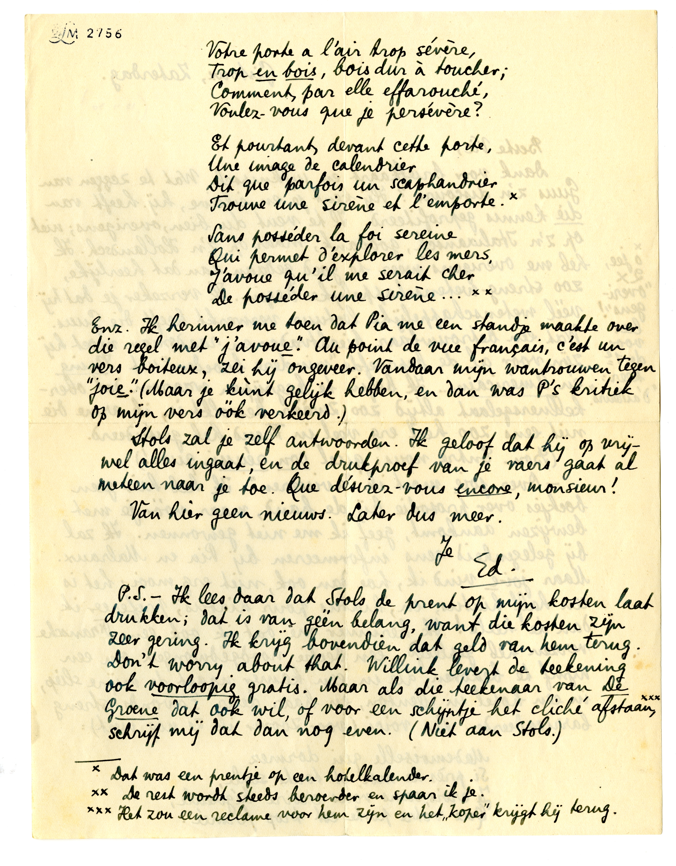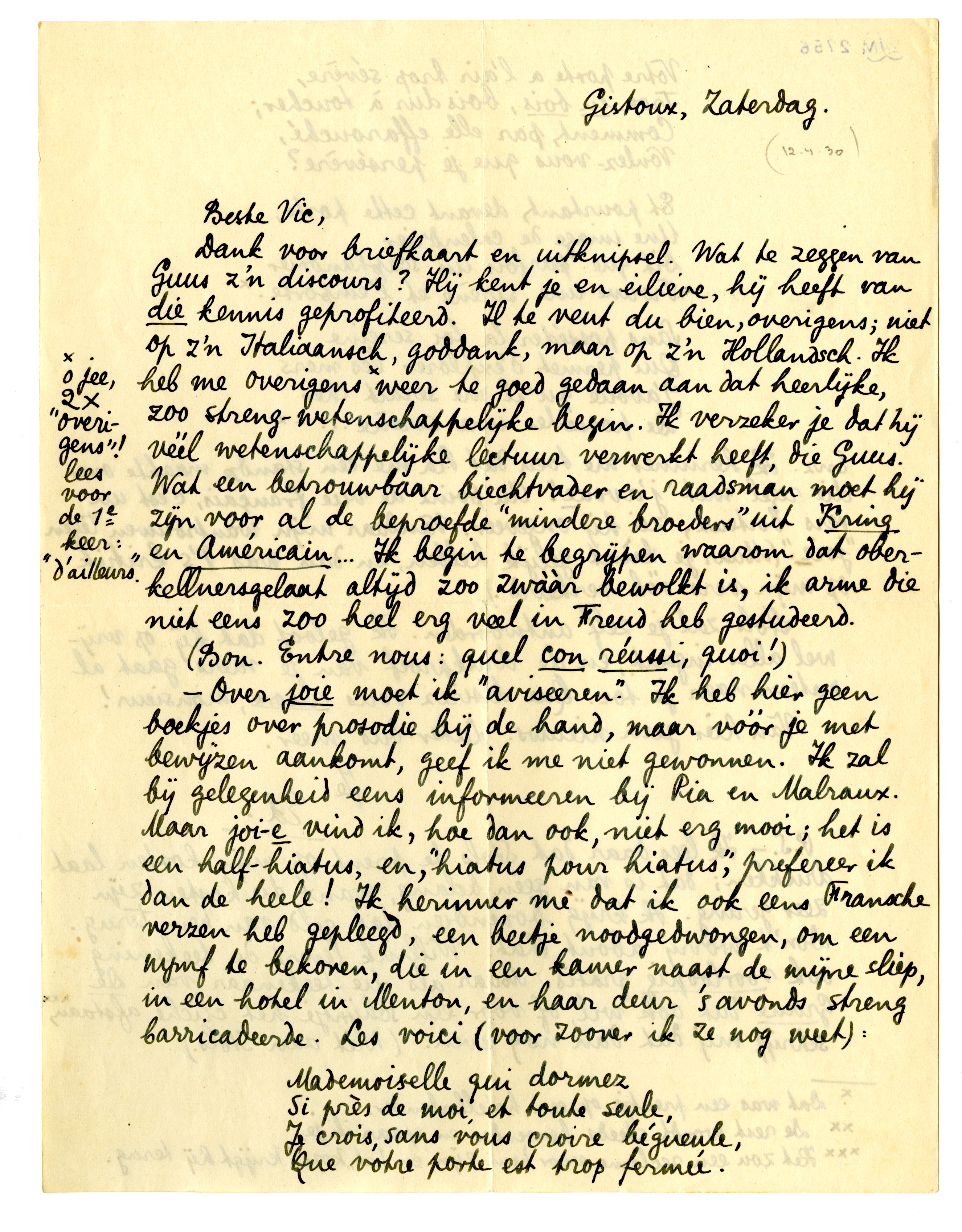 - Over joie moet ik ‘aviseeren’. Ik heb hier geen boekjes over prosodie bij de hand, maar vóór je met bewijzen aankomt, geef ik me niet gewonnen. Ik zal bij gelegenheid eens informeeren bij Pia en Malraux. Maar joi-e vind ik, hoe dan ook, niet erg mooi; het is een half-hiatus, en, ‘hiatus pour hiatus’, prefereer ik dan de heele! Ik herinner me dat ik ook eens Fransche verzen heb gepleegd, een beetje noodgedwongen, om een nymf te bekoren, die in een kamer naast de mijne sliep, in een hotel in Menton1034, en haar deur 's avonds streng barricadeerde. Les voici (voor zoover ik ze nog weet):