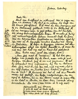 P.S. - Ik lees daar dat Stols de prent op mijn kosten laat drukken; dat is van géén belang, want die kosten zijn zeer gering. Ik krijg bovendien dat geld van hem terug. Don't worry about that. Willink levert de teekening ook voorloopig gratis. Maar als die teekenaar van De Groene1036 dat ook wil, of voor een schijntje het cliché afstaan,1037 schrijf mij dat dan nog even. (Niet aan Stols.)