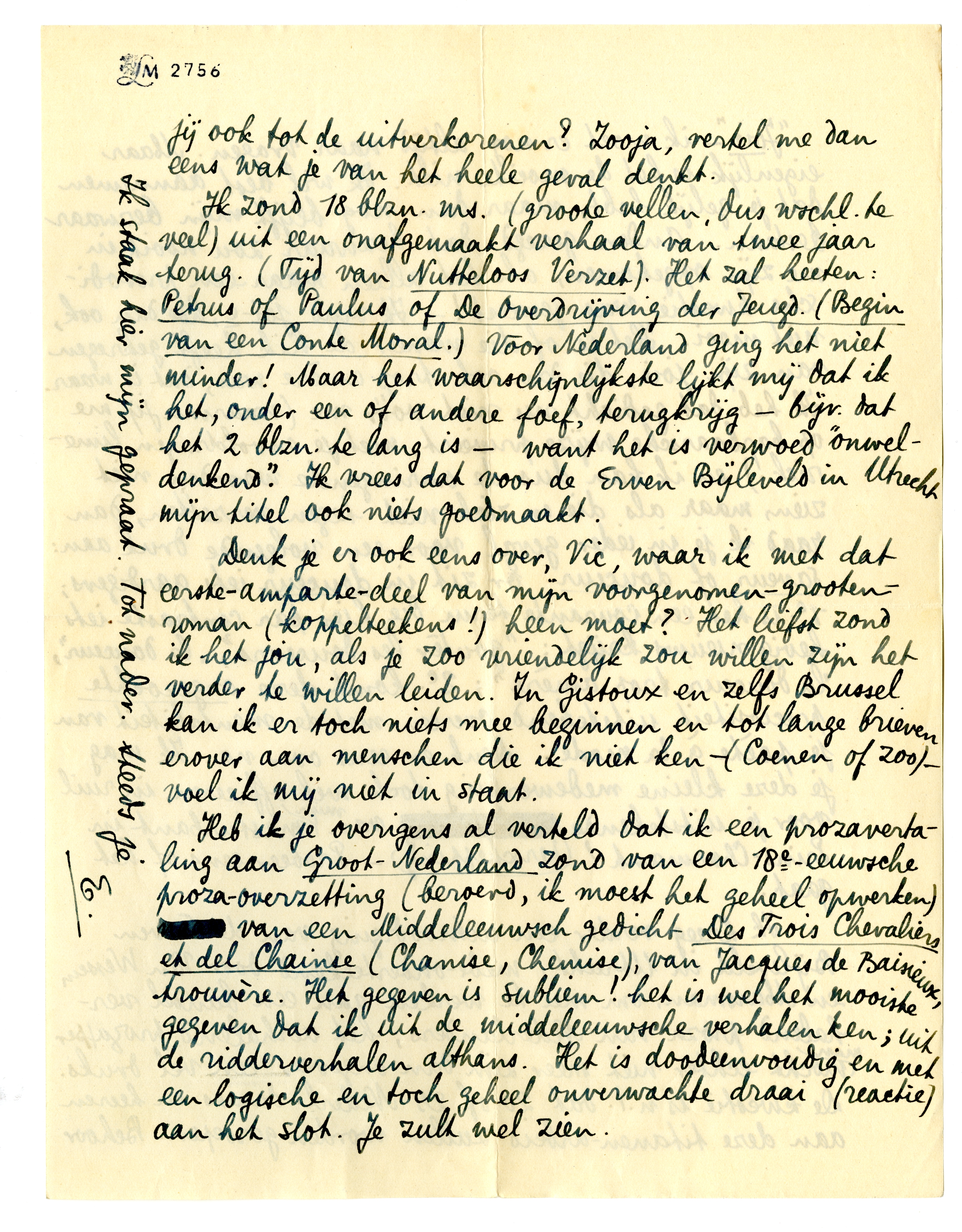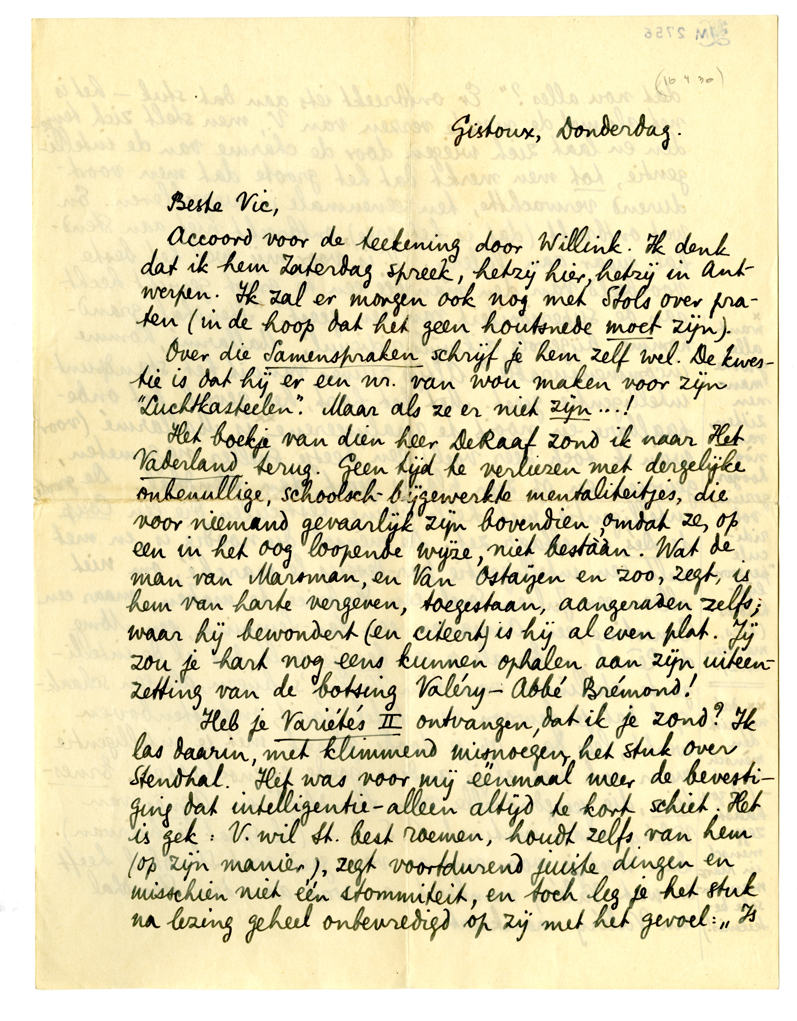 Denk je er ook eens over, Vic, waar ik met dat eerste-ampartedeel van mijn voorgenomen-grooten-roman (koppelteekens!) heen moet? Het liefst zond ik het jou, als je zoo vriendelijk zou willen zijn het verder te willen leiden. In Gistoux en zelfs Brussel kan ik er toch niets mee beginnen en tot lange brieven erover aan menschen die ik niet ken - (Coenen of zoo) - voel ik mij niet in staat.
