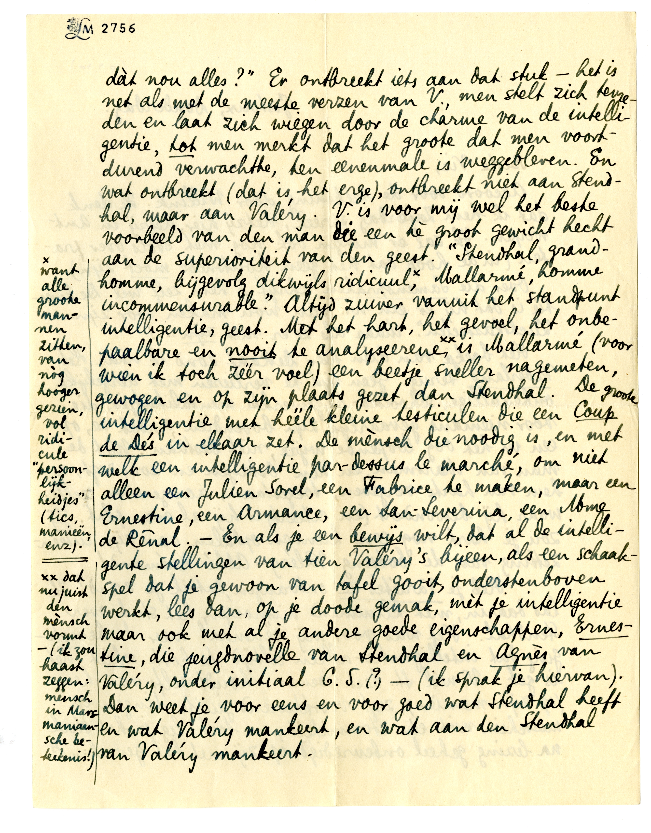 Heb je Variétés II ontvangen, dat ik je zond? Ik las daarin, met klimmend misnoegen, het stuk over Stendhal. Het was voor mij éénmaal meer de bevestiging dat intelligentie-alleen altijd te kort schiet. Het is gek: V. wil St. best roemen, houdt zelfs van hem (op zijn manier), zegt voortdurend juiste dingen en misschien niet één stommiteit, en toch leg je het stuk na lezing geheel onbevredigd op zij met het gevoel: ‘Is dàt nou alles?’ Er ontbreekt iets aan dat stuk - het is net als met de meeste verzen van V., men stelt zich tevreden en laat zich wiegen door de charme van de intelligentie, tot men merkt dat het groote dat men voortdurend verwachtte, ten eenenmale is weggebleven. En wat ontbreekt (dat is het erge), ontbreekt niet aan Stendhal, maar aan Valéry. V. is voor mij wel het bestse voorbeeld van den man die een tè groot gewicht hecht aan de superioriteit van den geest. ‘Stendhal, grand-homme, bijgevolg dikwijls ridicuul,* Mallarmé, homme incommensurable’. Altijd zuiver vanuit het standpunt intelligentie, geest. Met het hart, het gevoel, het onbepaalbare en nooit te analyseerene,1048 is Mallarmé (voor wien ik toch zéér voel) een beetje sneller nagemeten, gewogen en op zijn plaats gezet dan Stendhal. De groote intelligentie met hééle kleine testiculen die een Coup de Dés1049 in elkaar zet. De mènsch die noodig is, en met welk een intelligentie par-dessus le marché, om niet alleen een Julien Sorel, een Fabrice te maken, maar een Ernestine, een Armance, een San-Severina, een Mme de Rênal. - En als je een bewijs wilt, dat al de intelligente stellingen van tien Valéry's bijeen, als een schaakspel dat je gewoon van tafel gooit, onderstenboven werkt, lees dan, op je doode gemak, mèt je intelligentie maar ook met al je andere goede eigenschappen, Ernestine, die jeugdnovelle van Stendhal en Agnès van Valéry, onder initiaal C.S. (?)1050 - (ik sprak je hiervan). Dan weet je voor eens en voor goed wat Stendhal heeft en wat Valéry mankeert, en wat aan den Stendhal van Valéry mankeert.1051