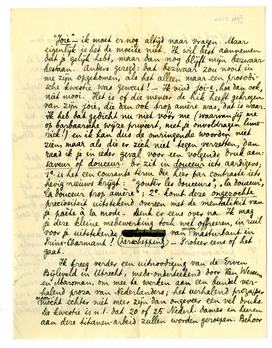 Ik kreeg verder een uitnoodiging van de Erven Bijleveld in Utrecht, mede-onderteekend door Van Wessem en Marsman, om mee te werken aan een bundel verhalend proza van Nederlanders; het verhalend proza per man mocht echter niet veel meer zijn dan ongeveer een vel druks. De kwestie is n.l. dat 20 of 25 Nederl. dames en heeren aan deze titanen-arbeid zullen worden geroepen. Behoor jij ook tot de uitverkorenen? Zooja, vertel me dan eens wat je van het heele geval denkt.