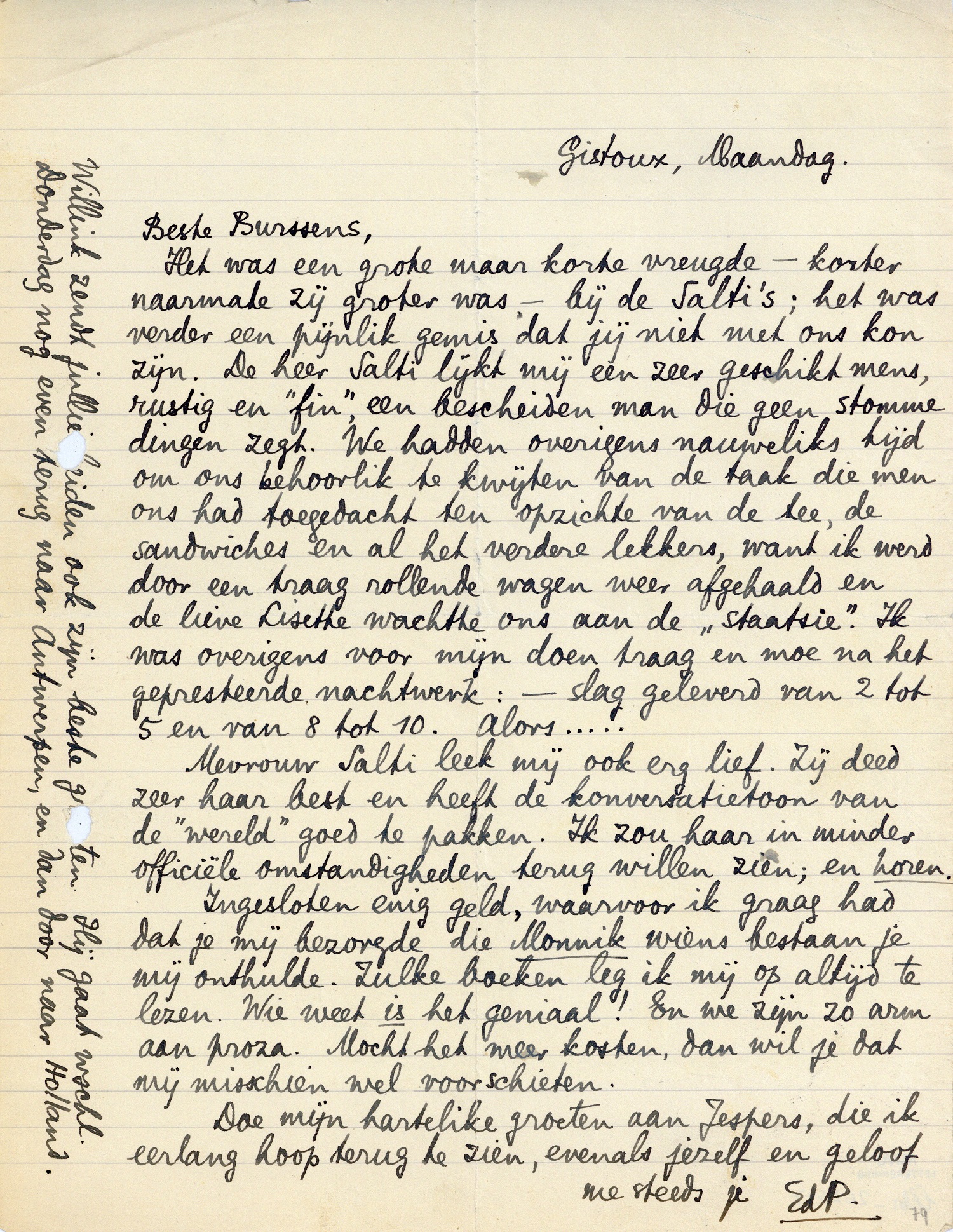 Het was een grote maar korte vreugde - korter naarmate zij groter was, - bij de Salti's; het was verder een pijnlik gemis dat jij niet met ons kon zijn. De heer Salti lijkt mij een zeer geschikt mens, rustig en ‘fin’, een bescheiden man die geen stomme dingen zegt. We hadden overigens nauweliks tijd om ons behoorlik te kwijten van de taak die men ons had toegedacht ten opzichte van de tee, de sandwiches en al het verdere lekkers, want ik werd door een traag rollende wagen weer afgehaald en de lieve Lisette1090 wachtte ons aan de ‘staatsie’. Ik was overigens voor mijn doen traag en moe na het gepresteerde nachtwerk: - slag geleverd van 2 tot 5 en van 8 tot 10. Alors.....