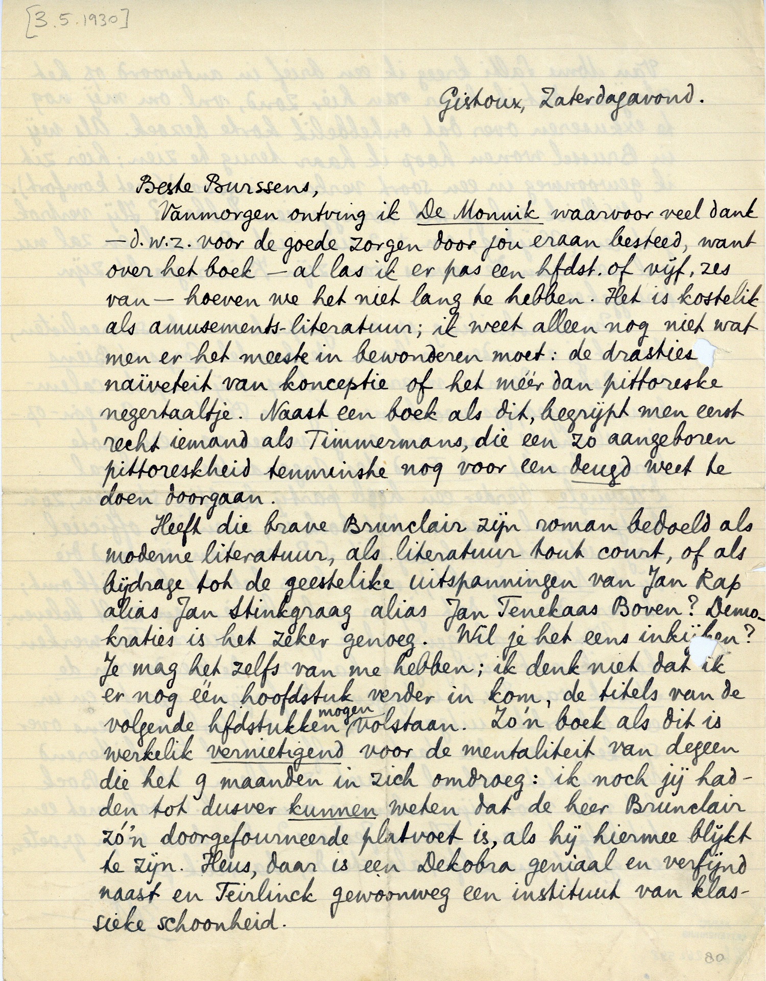 Vanmorgen ontving ik De Monnik waarvoor veel dank - d.w.z. voor de goede zorgen door jou eraan besteed, want over het boek - al las ik er pas een hfdst. of vijf, zes van - hoeven we het niet lang te hebben. Het is kostelik als amusements-literatuur; ik weet alleen nog niet wat men er het meeste in bewonderen moet: de drasties naïveteit van konceptie of het méér dan pittoreske negertaaltje. Naast een boek als dit, begrijpt men eerst recht iemand als Timmermans, die een zo aangeboren pittoreskheid tenminste nog voor een deugd weet te doen doorgaan.