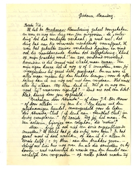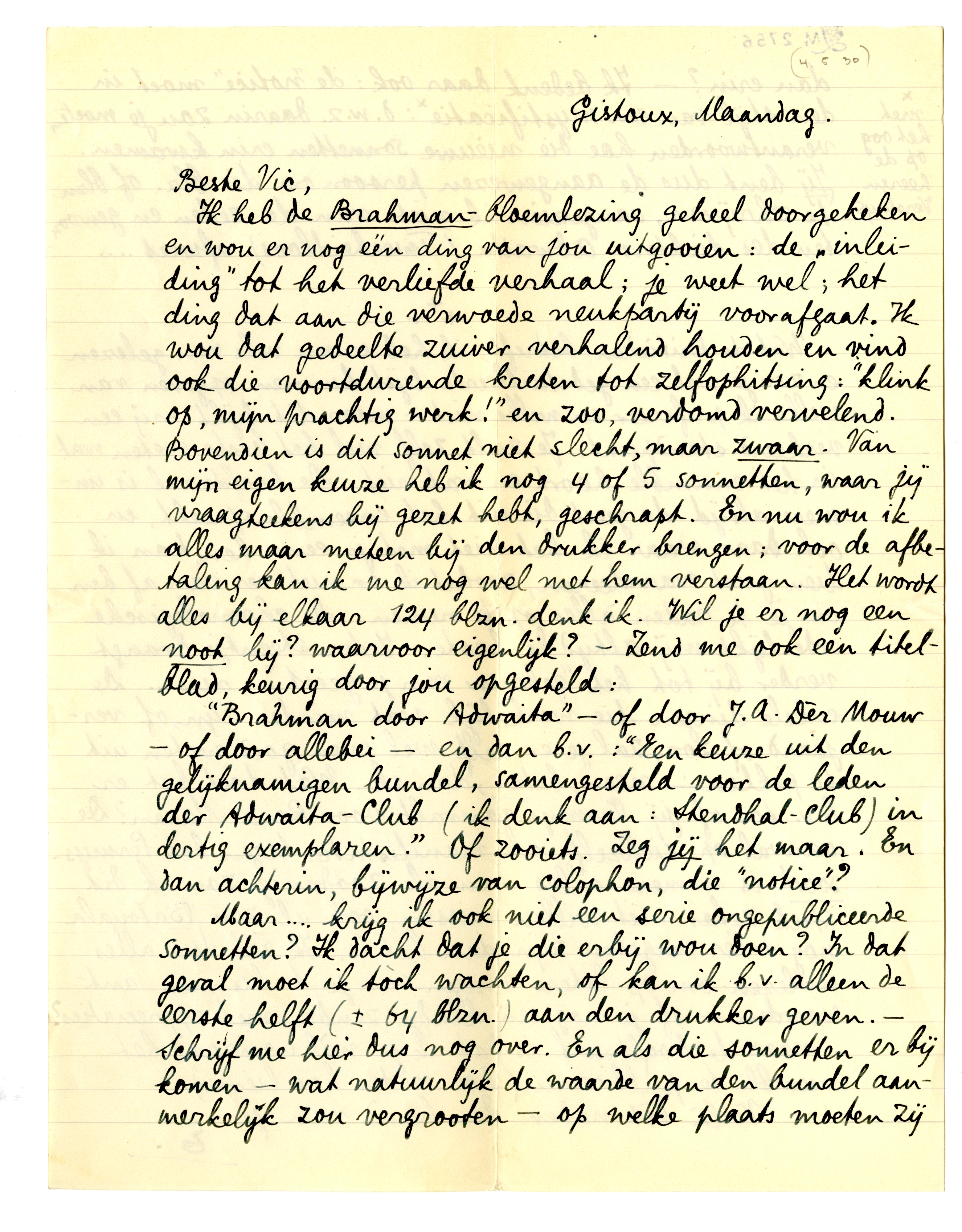 Ik heb de Brahman-bloemlezing geheel doorgekeken en wou er nog één ding van jou uitgooien: de ‘inleiding’ tot het verliefde verhaal; je weet wel; het ding dat aan die verwoede neukpartij voorafgaat. Ik wou dat gedeelte zuiver verhalend houden en vind ook die voortdurende kreten tot zelfophitsing: ‘klink op, mijn prachtig werk!’ en zoo, verdomd vervelend. Bovendien is dit sonnet niet slecht, maar zwaar. Van mijn eigen keuze heb ik nog 4 of 5 sonnetten, waar jij vraagteekens bij gezet hebt, geschrapt. En nu wou ik alles maar meteen bij den drukker brengen; voor de afbetaling kan ik me nog wel met hem verstaan. Het wordt alles bij elkaar 124 blzn. denk ik. Wil je er nog een noot bij? waarvoor eigenlijk? - Zend me ook een titelblad, keurig door jou opgesteld:
