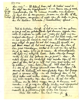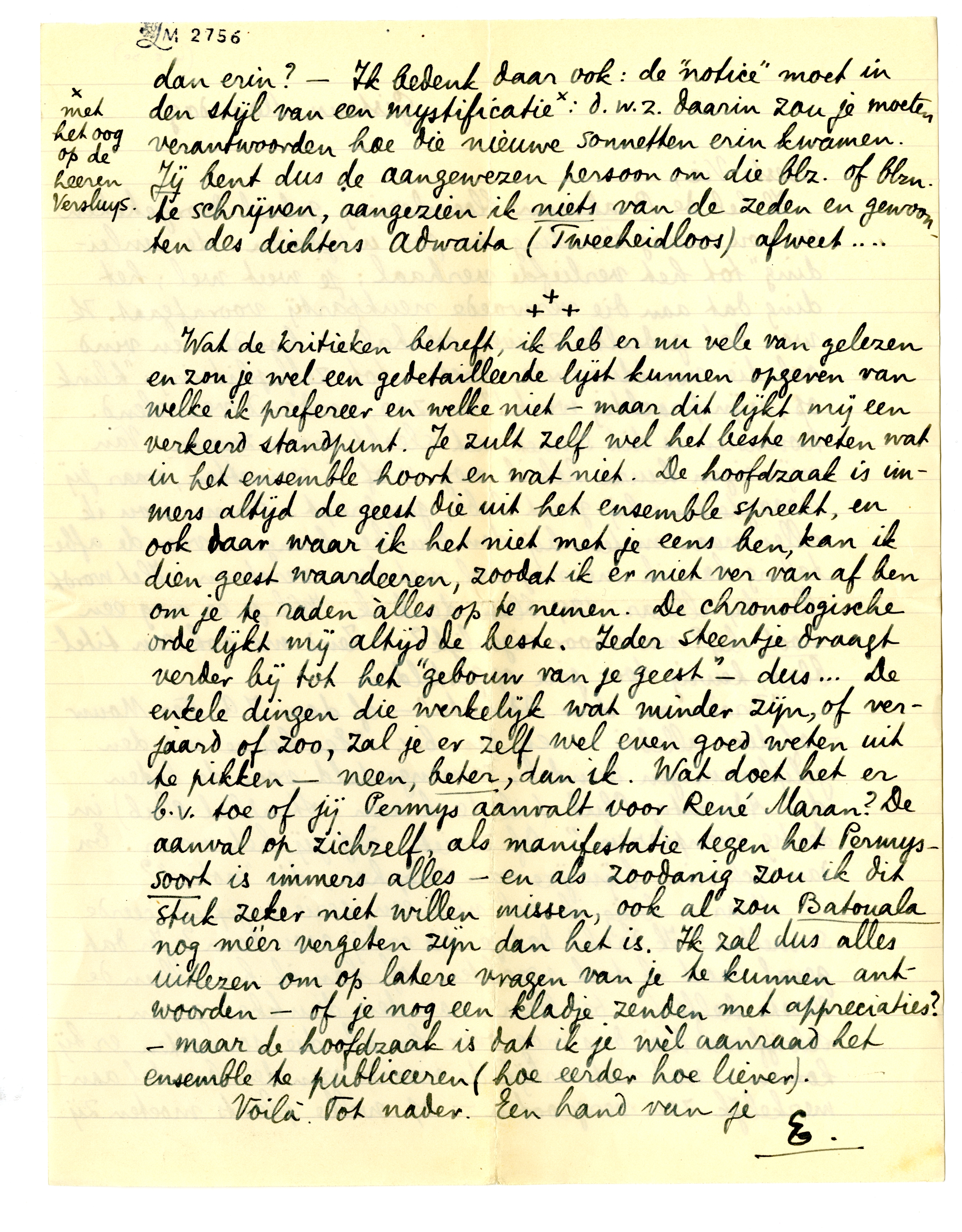 Maar.... krijg ik ook niet een serie ongepubliceerde sonnetten? Ik dacht dat je die erbij wou doen? In dat geval moet ik tòch wachten, of kan ik b.v. alleen de eerste helft (± 64 blzn.) aan den drukker geven. - Schrijf me hier dus nog over. En als die sonnetten er bij komen - wat natuurlijk de waarde van den bundel aanmerkelijk zou vergrooten - op welke plaats moeten zij dan erin? - Ik bedenk daar ook: de ‘notice’ moet in den stijl van een mystificatie*: d.w.z. daarin zou je moeten verantwoorden hoe die nieuwe sonnetten erin kwamen. Jij bent dus de aangewezen persoon om die blz. of blzn. te schrijven, aangezien ik niets van de zeden en gewoonten des dichters Adwaita (Tweeheidloos) afweet....