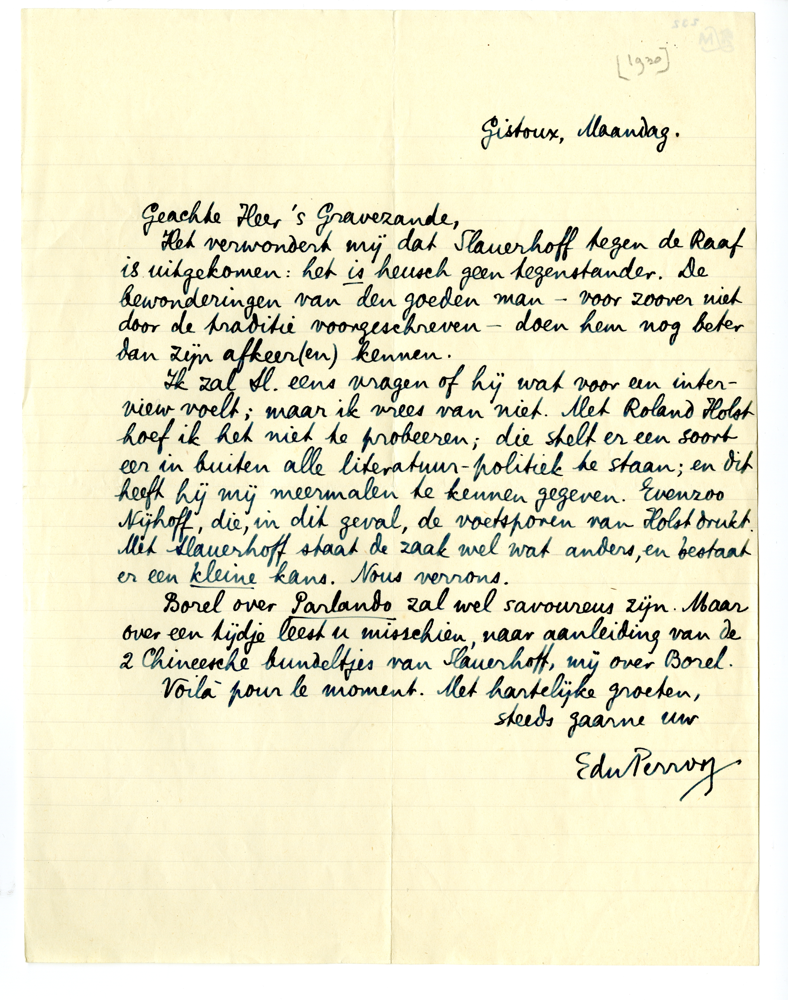 Ik zal Sl. eens vragen of hij wat voor een interview voelt; maar ik vrees van niet. Met Roland Holst hoef ik het niet te probeeren; die stelt er een soort eer in buiten alle literatuur-politiek te staan; en dit heeft hij mij meermalen te kennen gegeven. Evenzoo Nijhoff, die, in dit geval, de voetsporen van Holst drukt. Met Slauerhoff staat de zaak wel wat anders, en bestaat er een kleine kans. Nous verrons.