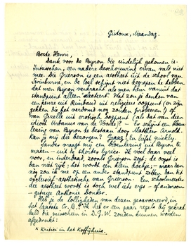 Sander vraagt mij een bloemlezing uit Byron te maken - uit de shorter lyrics.1131Ik voel daar veel voor, en inderdaad, zooals Grierson zegt: de oogst is dan niet rijk; het wordt een klein boekje; - maar dan nòg zou ik me op een ander standpunt zetten dan dit exclusief-aesthetische van Grierson. Een schoolmeester die aestheet wordt is toch wel iets ergs - of andersom - getuige Anthonie Donker.