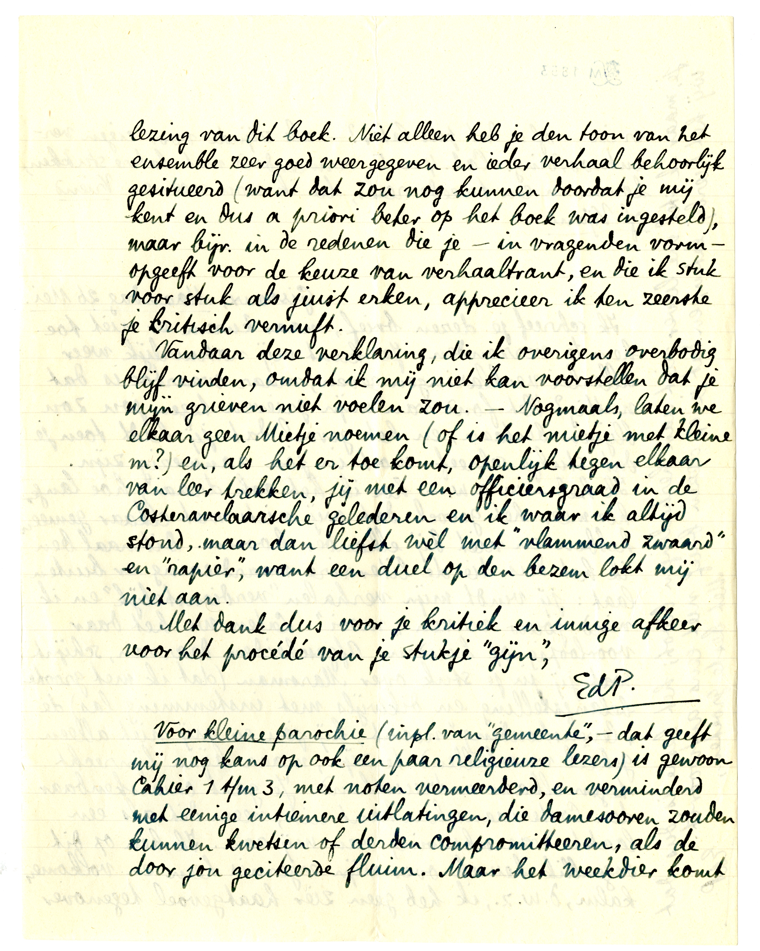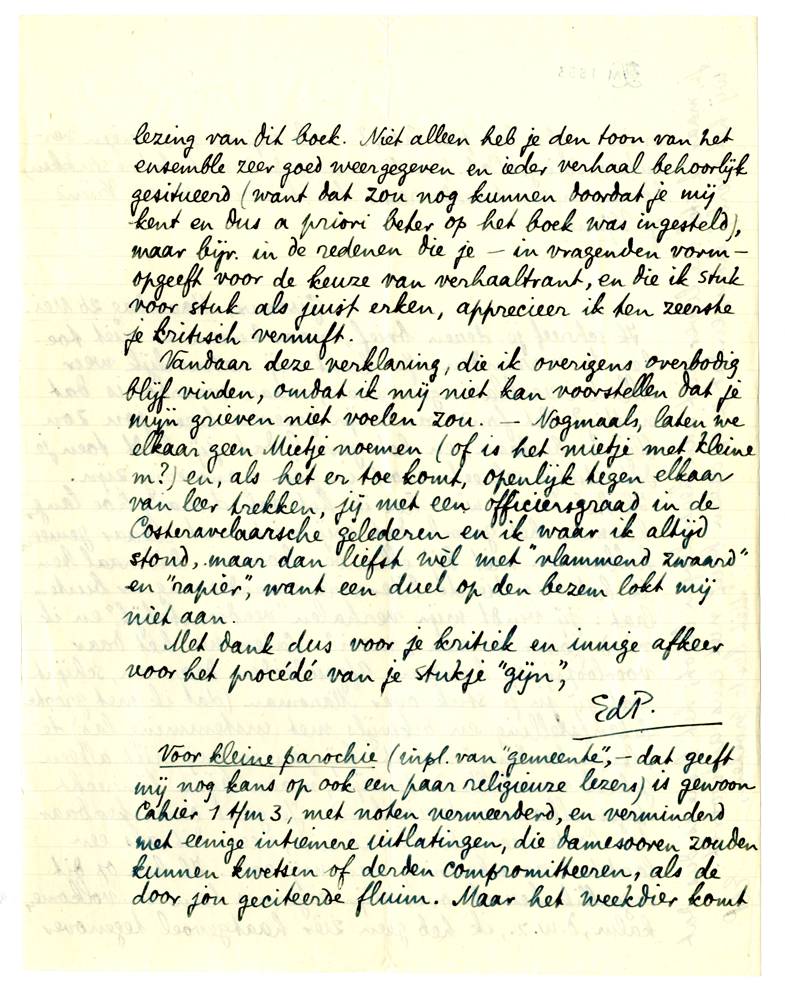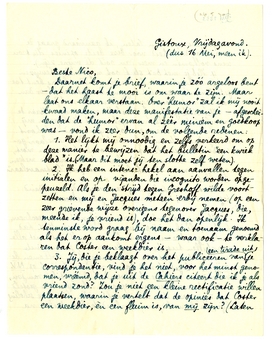 Ik zou je misschien dezen brief niet eens geschreven hebben, als ik niet gisteren je kritiek op N.V. had ontvangen, die me weer te kennen geeft dat, met alle verschillen tusschen ons als mensch, je tenminste in staat bent tot een - verstandelijk - volkomen begrijpen. Ik geloof niet dat er nog één kritiek op N.V. verschijnen zal, die ik liever, dan dit artikel van jou, zou zenden aan iemand op wien ik bijv. zeer gesteld zou zijn, maar die, door onvoldoende literaire scholing bijv, de kans liep mij verkeerd te beoordeelen na lezing van dit boek. Niet alleen heb je den toon van het ensemble zeer goed weergegeven en ieder verhaal behoorlijk gesitueerd (want dat zou nog kunnen doordat je mij kent en dus a priori beter op het boek was ingesteld), maar bijv. in de redenen die je - in vragenden vorm - opgeeft voor de keuze van verhaaltrant, en die ik stuk voor stuk als juist erken, apprecieer ik ten zeerste je kritisch vernuft.