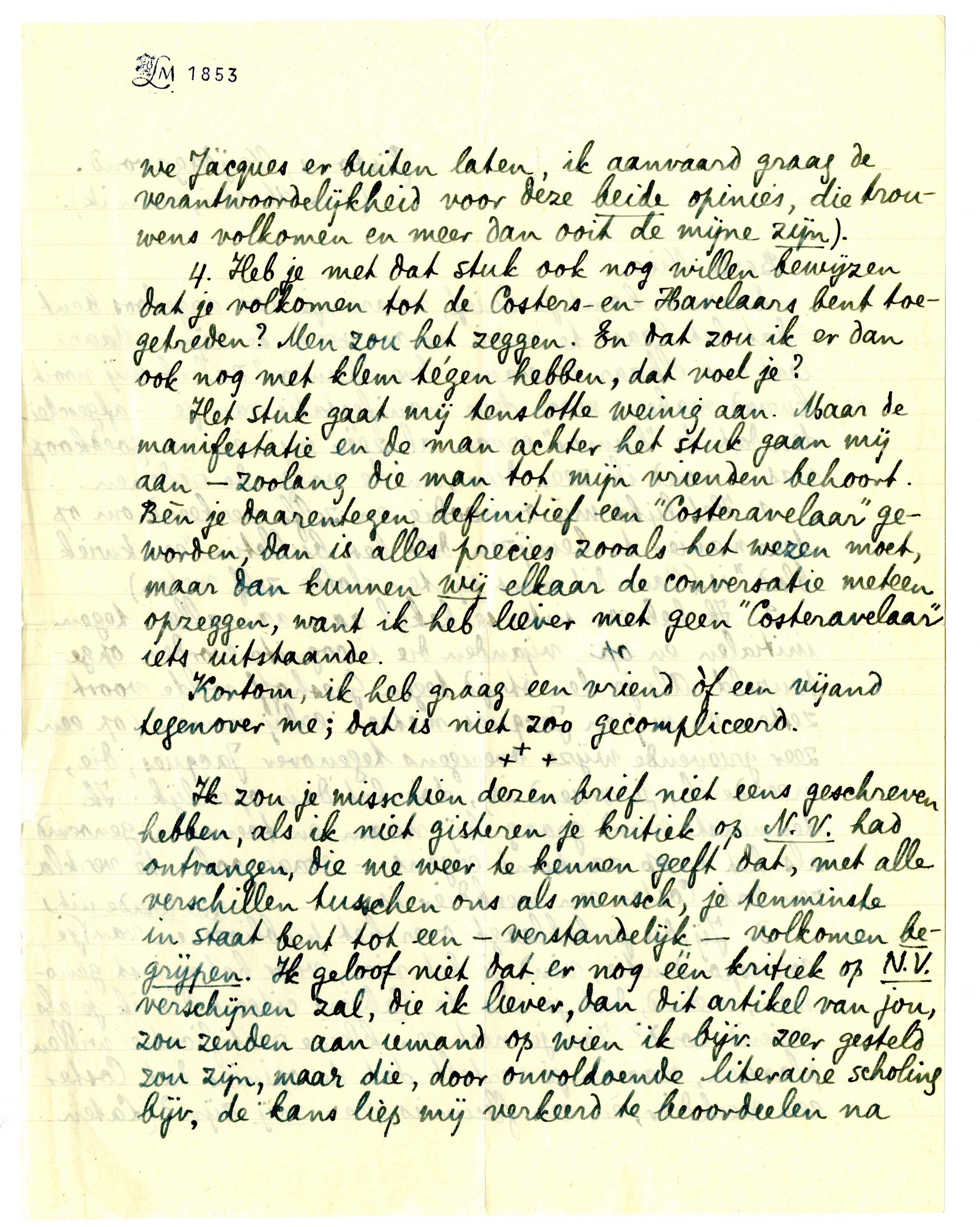 | 2. | Ik heb een intense hekel aan aanvallen tegen initialen en op vijanden die incognito worden opgepeuzeld. Als je den strijd tegen Greshoff wilde voortzetten en mij en Jacques meteen erbij nemen (op een zeer grievende wijze overigens tegenover Jacques, die, meende ik, je vriend is), doe het dan openlijk. Ik tenminste word graag bij naam en toenaam genoemd als het er op aankomt ergens - waar ook - te verklaren dat Coster een weekdier is. |