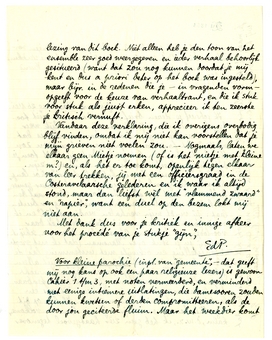 Ik schreef je dezen brief, maar kwam er niet toe hem te verzenden. Je kunt mij natuurlijk weer allerlei verklaringen geven, maar waartoe is dat nuttig? Het fond van mijn grieven tegen jou zou blijven bestaan, en het gevoel dat jij hadt toen je dat stukje schreef, moet in jou aanwezig zijn. Ik heb - m.a.w. - hoe ik het ook draai, hoe langer hoe meer het gevoel dat wij niets met elkaar gemeen hebben en niet bij elkander hooren. Ditmaal ben ik het dus die de literaire waardeering er buiten laat: jij vindt mijn verhalen ‘verdienstelijk’ en ik vind jouw verzen ‘mooi’. Laten we het daar voorloopig op houden. Afgescheiden daarvan, schijnt wat jij in je stuk over Marsman1135 (dat ik met groote belangstelling en dikwijls met instemming las) de ‘levenshouding’ noemt, bij jou en mij niet alleen geheel verschillend te zijn, maar bijna lijnrecht tegen elkaar indruischend. Je gaat onmiskenbaar den Costeriaanschen kant uit; neem dit als een laatste waarschuwing van mij aan. Ik ben op dit oogenblik heusch over mijn ergernis heen en volkomen kalm, d.w.z. ik heb geen zier haatgevoel tegenover je, maar ik stel me liever niet aan herhalingen bloot; het beste is dus dat wij het hierbij laten, en dat je op dezen brief niet eens antwoordt.