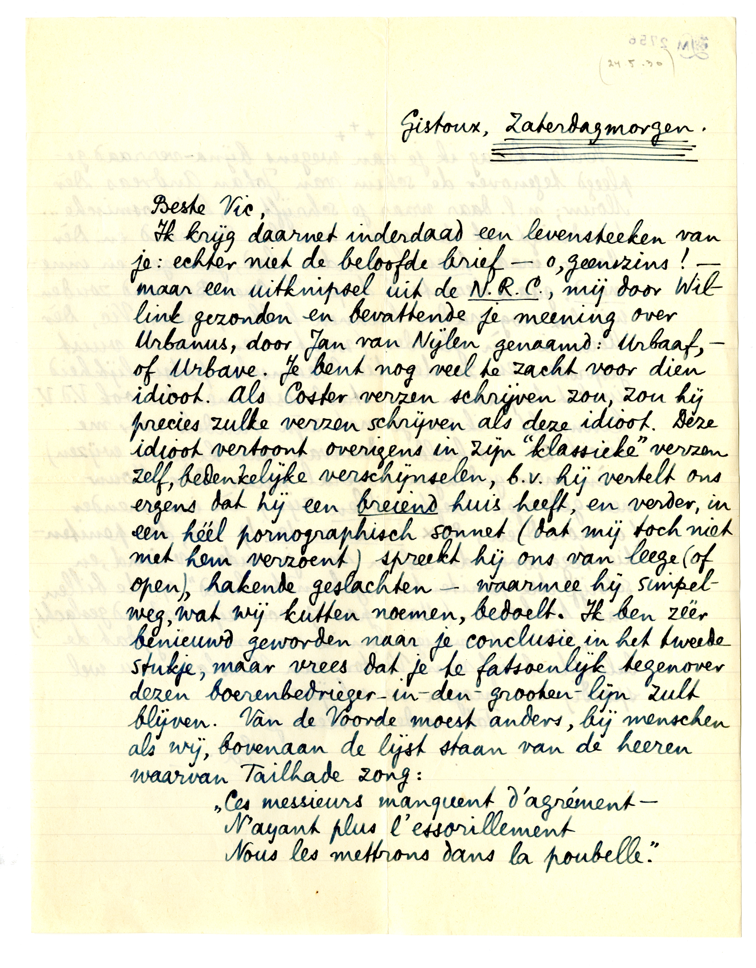 Ik krijg daarnet inderdaad een levensteeken van je: echter niet de beloofde brief - o, geenszins! - maar een uitknipsel uit de N.R.C.1146, mij door Willink gezonden en bevattende je meening over Urba-nus, door Jan van Nijlen genaamd: Urbaaf, - of Urbave. Je bent nog veel te zacht voor dien idioot. Als Coster verzen schrijven zou, zou hij precies zulke verzen schrijven als deze idioot. Deze idioot vertoont overigens in zijn ‘klassieke’ verzen zelf, bedenkelijke verschijnselen, b.v. hij vertelt ons ergens dat hij een breiend huis heeft, en verder, in een héél pornographisch sonnet (dat mij toch niet met hem verzoent) spreekt hij ons van leege (of open), hakende geslachten - waarmee hij simpelweg, wat wij kutten noemen, bedoelt. Ik ben zéér benieuwd geworden naar je conclusie in het tweede stukje, maar vrees dat je te fatsoenlijk tegenover deze boerenbedrieger-inden-grooten-lijn zult blijven. Van de Voorde moest anders, bij menschen als wij, bovenaan de lijst staan van de heeren waarvan Tailhade zong: