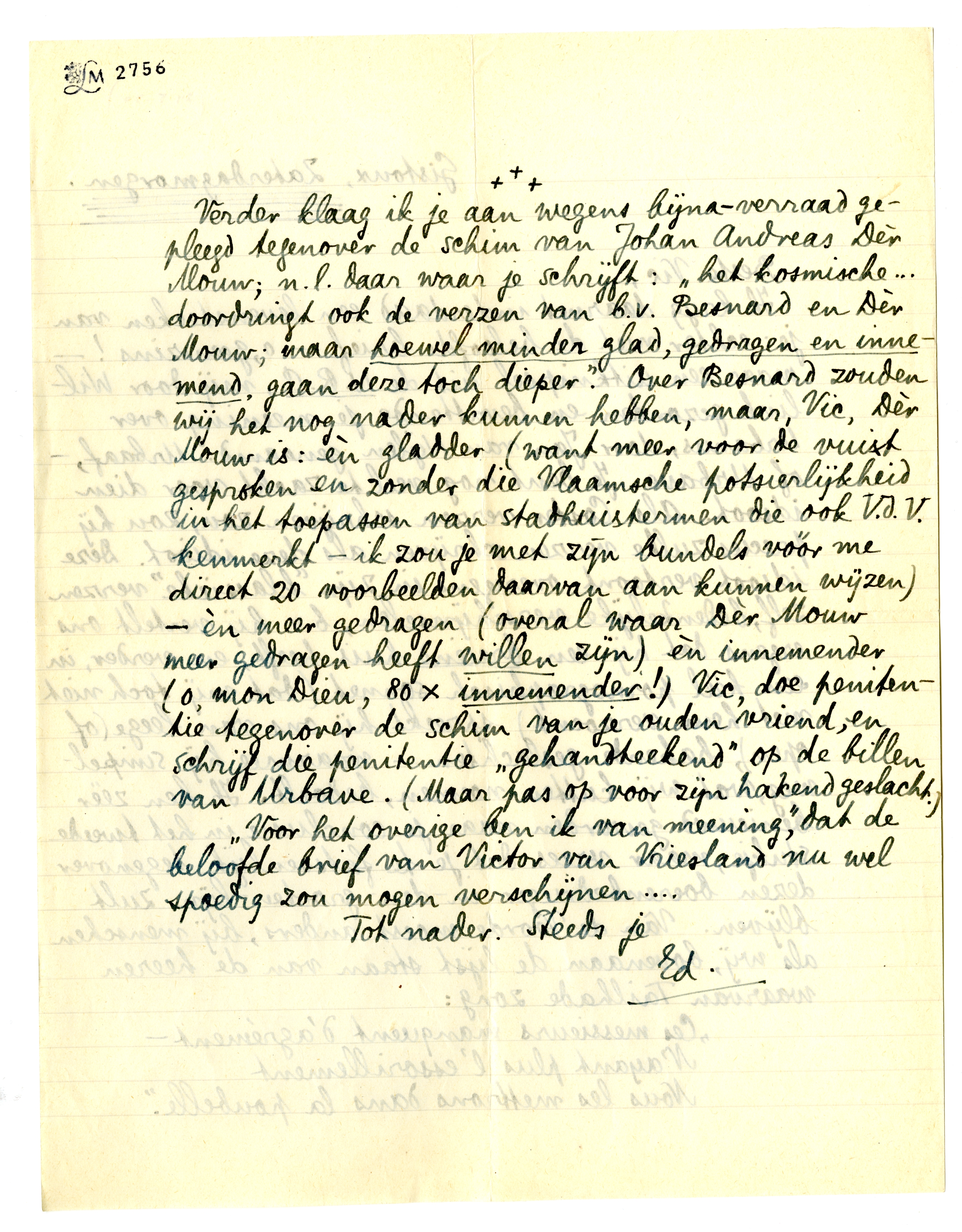 Verder klaag ik je aan wegens bijna-verraad gepleegd tegenover de schim van Johan Andreas Dèr Mouw; n.l. daar waar je schrijft: ‘het kosmische... doordringt ook de verzen van b.v. Besnard en Dèr Mouw; maar hoewel minder glad, gedragen en innemend, gaan deze toch dieper.’ Over Besnard zouden wij het nog nader kunnen hebben, maar, Vic, Dèr Mouw is: èn gladder (want meer voor de vuist gesproken en zonder die Vlaamsche potsierlijkheid in het toepassen van stadhuistermen die ook V.d.V. kenmerkt - ik zou je met zijn bundels vóór me direct 20 voorbeelden daarvan aan kunnen wijzen) - èn meer gedragen (overal waar Dèr Mouw meer gedragen heeft willen zijn) èn innemender (o, mon Dieu, 80 × innemender!) Vic, doe penitentie tegenover de schim van je ouden vriend, en schrijf die penitentie ‘gehandteekend’ op de billen van Urbave. (Maar pas op voor zijn hakend geslacht.)