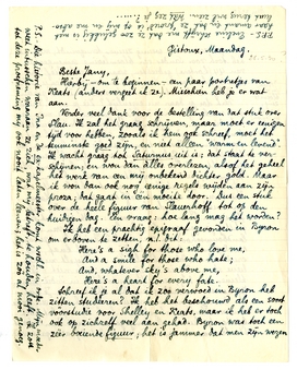 Schreef ik je al dat ik zoo verwoed in Byron heb zitten studeeren? Ik heb het beschouwd als een soort vóórstudie voor Shelley en Keats, maar ik heb er toch ook op zichzelf veel aan gehad. Byron was toch een zéér boeiende figuur; het is jammer dat men zijn wezen in zijn verzen zoo weinig zuiver terugvindt; maar ik heb toch voor Sander een bloemlezing samengesteld van 44 (kortere) gedichten, waarvan vele ‘lief’ en sommige heel mooi. Maar wat een bom rhetorica is er bij!*