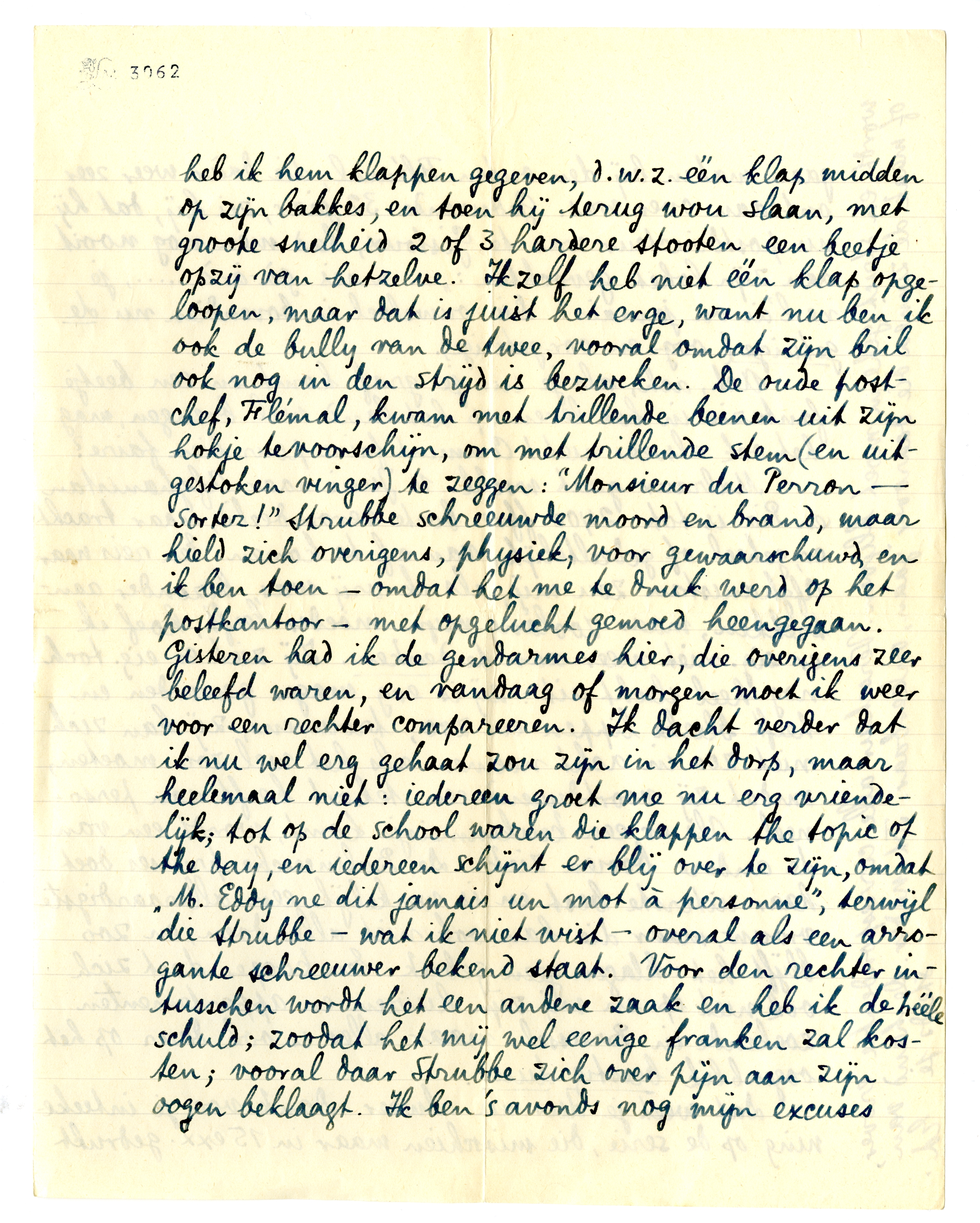 Overigens niet veel nieuws. Ik heb weer een beetje een vervelend geval gehad, n.l. ik ben op het postkantoortje hier in botsing geraakt met dien rotvent Strubbe van de Sapinière, en omdat hij arrogant werd, heb ik hem klappen gegeven, d.w.z. één klap midden op zijn bakkes, en toen hij terug wou slaan, met groote snelheid 2 of 3 hardere stooten een beetje opzij van hetzelve. Ikzelf heb niet één klap opgeloopen, maar dat is juist het erge, want nu ben ik ook de bully van de twee, vooral omdat zijn bril ook nog in den strijd is bezweken. De oude postchef, Flémal, kwam met trillende beenen uit zijn hokje tevoorschijn, om met trillende stem (en uitgestoken vinger) te zeggen: ‘Monsieur du Perron - sortez!’ Strubbe schreeuwde moord en brand, maar hield zich overigens, physiek, voor gewaarschuwd, en ik ben toen - omdat het me te druk werd op het postkantoor - met opgelucht gemoed heengegaan. Gisteren had ik de gendarmes hier, die overigens zeer beleefd waren, en vandaag of morgen moet ik weer voor een rechter compareeren. Ik dacht verder dat ik nu wel erg gehaat zou zijn in het dorp, maar heelemaal niet: iedereen groet me nu erg vriendelijk; tot op de school waren die klappen the topic of the day, en iedereen schijnt er blij over te zijn, omdat ‘M. Eddy ne dit jamais un mot à personne’, terwijl die Strubbe - wat ik niet wist - overal als een arrogante schreeuwer bekend staat. Voor den rechter intusschen wordt het een andere zaak en heb ik de hééle schuld; zoodat het mij wel eenige franken zal kosten; vooral daar Strubbe zich over pijn aan zijn oogen beklaagt. Ik ben 's avonds nog mijn excuses gaan maken bij den ouden Flémal, die dààr weer zeer ontdaan over was. Gedurende 32 jaar, zei hij, dat hij nu postdirecteur was te Gistoux, had men nog nooit aan zijn loket gevochten: ‘... mais çà-à-à....., je ne l'ai vu jamais’. Die ouweloel is bovendien nu de getuige (oog-en oor-getuige).