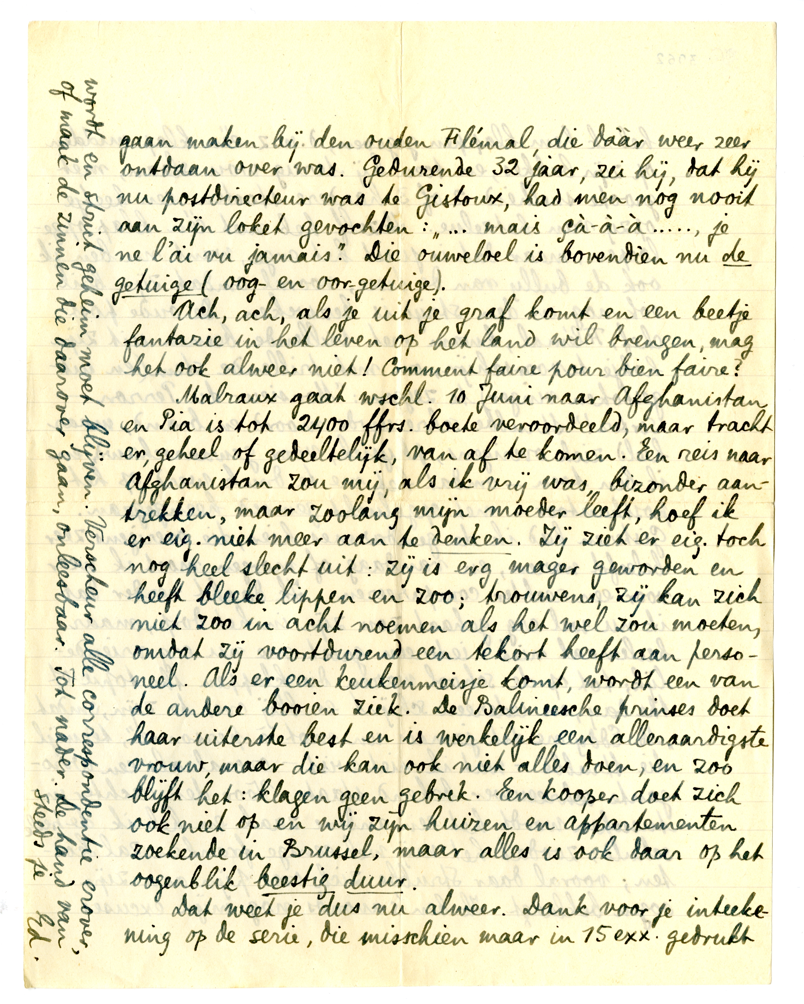 Malraux gaat wschl. 10 Juni naar Afghanistan en Pia is tot 2400 ffrs. boete veroordeeld, maar tracht er, geheel of gedeeltelijk, van af te komen. Een reis naar Afghanistan zou mij, als ik vrij was, bizonder aantrekken, maar zoolang mijn moeder leeft, hoef ik er eig. niet meer aan te denken. Zij ziet er eig. toch nog heel slecht uit: zij is erg mager geworden en heeft bleeke lippen en zoo; trouwens, zij kan zich niet zoo in acht noemen als het wel zou moeten, omdat zij voortdurend een tekort heeft aan personeel. Als er een keukenmeisje komt, wordt een van de andere booien ziek. De Balineesche prinses doet haar uiterste best en is werkelijk een alleraardigste vrouw, maar die kan ook niet alles doen, en zoo blijft het: klagen geen gebrek. Een kooper doet zich ook niet op en wij zijn huizen en appartementen zoekende in Brussel, maar alles is ook daar op het oogenblik beestig duur.