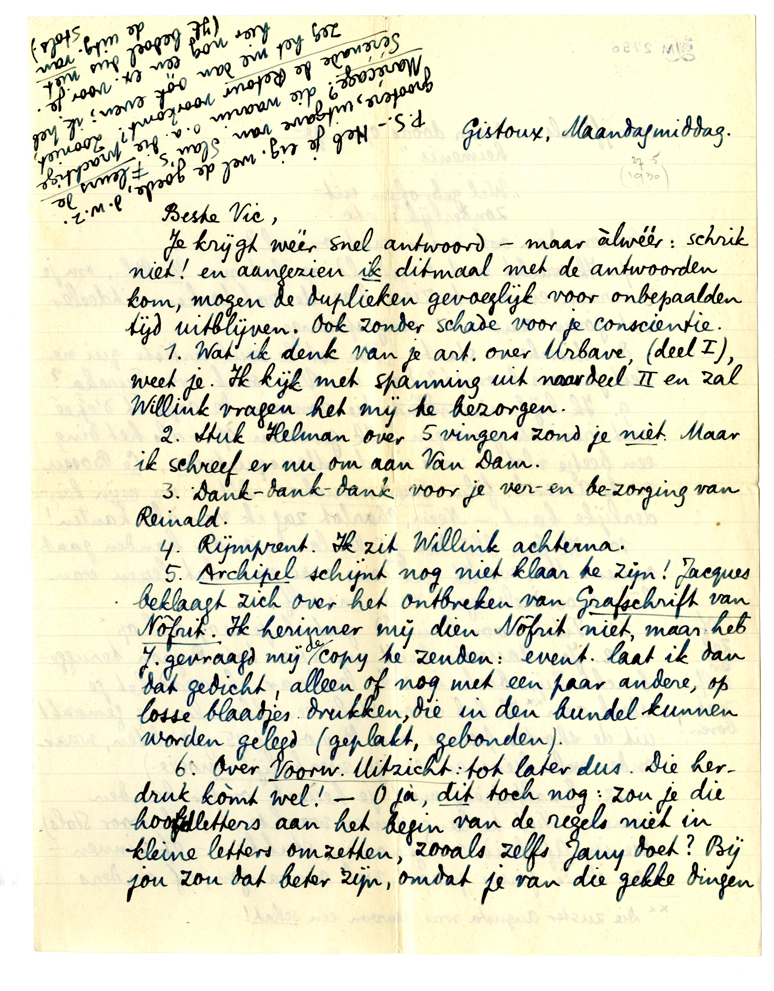 | 5. | Archipel schijnt nog niet klaar te zijn! Jacques beklaagt zich over het ontbreken van Grafschrift van Nôfrit. Ik herinner mij dien Nôfrit niet, maar heb J. gevraagd mij de copy te zenden: event. laat ik dan dat gedicht, alleen of nog met een paar andere, op losse blaadjes drukken, die in den bundel kunnen worden gelegd (geplakt, gebonden). |