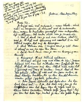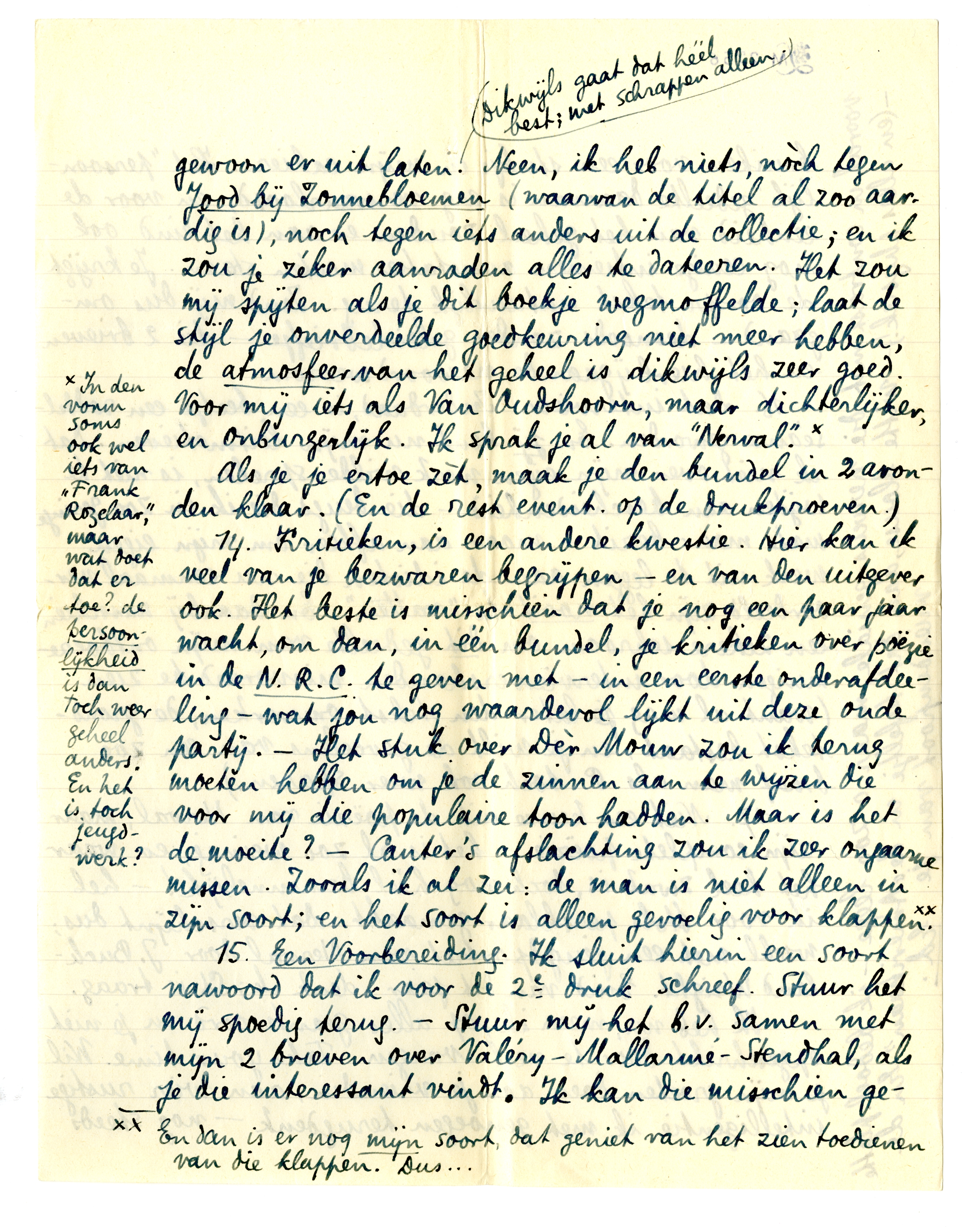 | 15. | Een Voorbereiding. Ik sluit hierin een soort nawoord dat ik voor de 2e druk schreef.1155 Stuur het mij spoedig terug. - Stuur mij het b.v. samen met mijn 2 brieven over Valéry-Mallarmé-Stendhal, als je die interessant vindt. Ik kan die misschien gebruiken voor een stukje in mijn cahiers.1156 Het ‘persoonlijk’ gedeelte daarvan is erg verwaarloosd, en voor de eenheid van het geheel zouden er aan het eind ook nog eenige intiemere annotaties moeten staan. Je krijgt de oorspr. tekst natuurlijk terug. Zend mij dus omgaand - desnoods zonder geleidebriefje - die 2 brieven en het hierbijgaande nawoord weerom. |