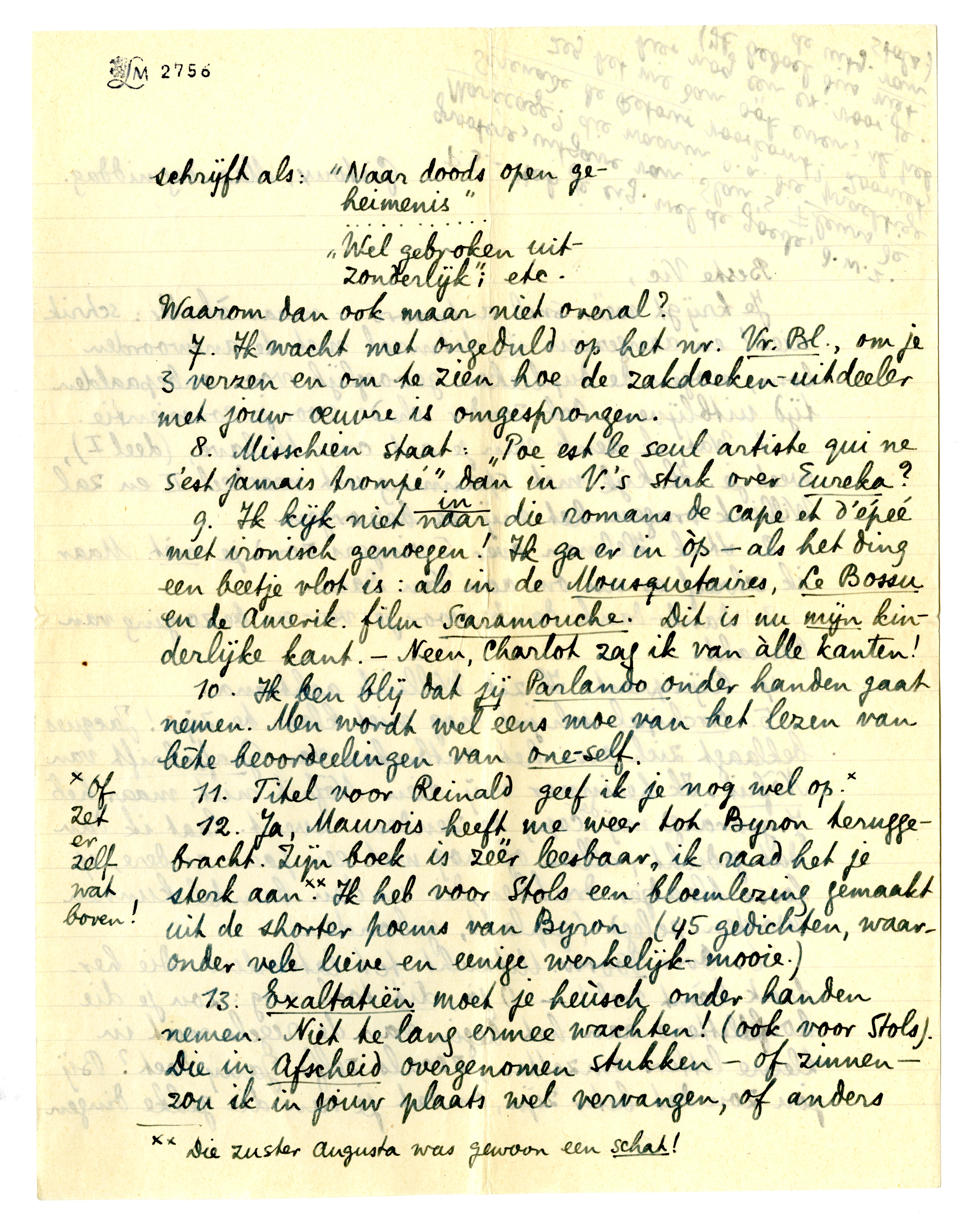 Exaltatiën moet je heùsch onder handen nemen. Niet te lang ermee wachten! (ook voor Stols). Die in Afscheid overgenomen stukken - of zinnen - zou ik in jouw plaats wel vervangen, of anders gewoon er uit laten.1153 Neen, ik heb niets, nòch tegen Jood bij Zon-nebloemen (waarvan de titel al zoo aardig is), noch tegen iets anders uit de collectie; en ik zou je zéker aanraden alles te dateeren. Het zou mij spijten als je dit boekje wegmoffelde; laat de stijl je onverdeelde goedkeuring niet meer hebben, de atmosfeer van het geheel is dikwijls zeer goed. Voor mij iets als Van Oudshoorn, maar dichterlijker, en onburgerlijk. Ik sprak je al van ‘Nerval’.*