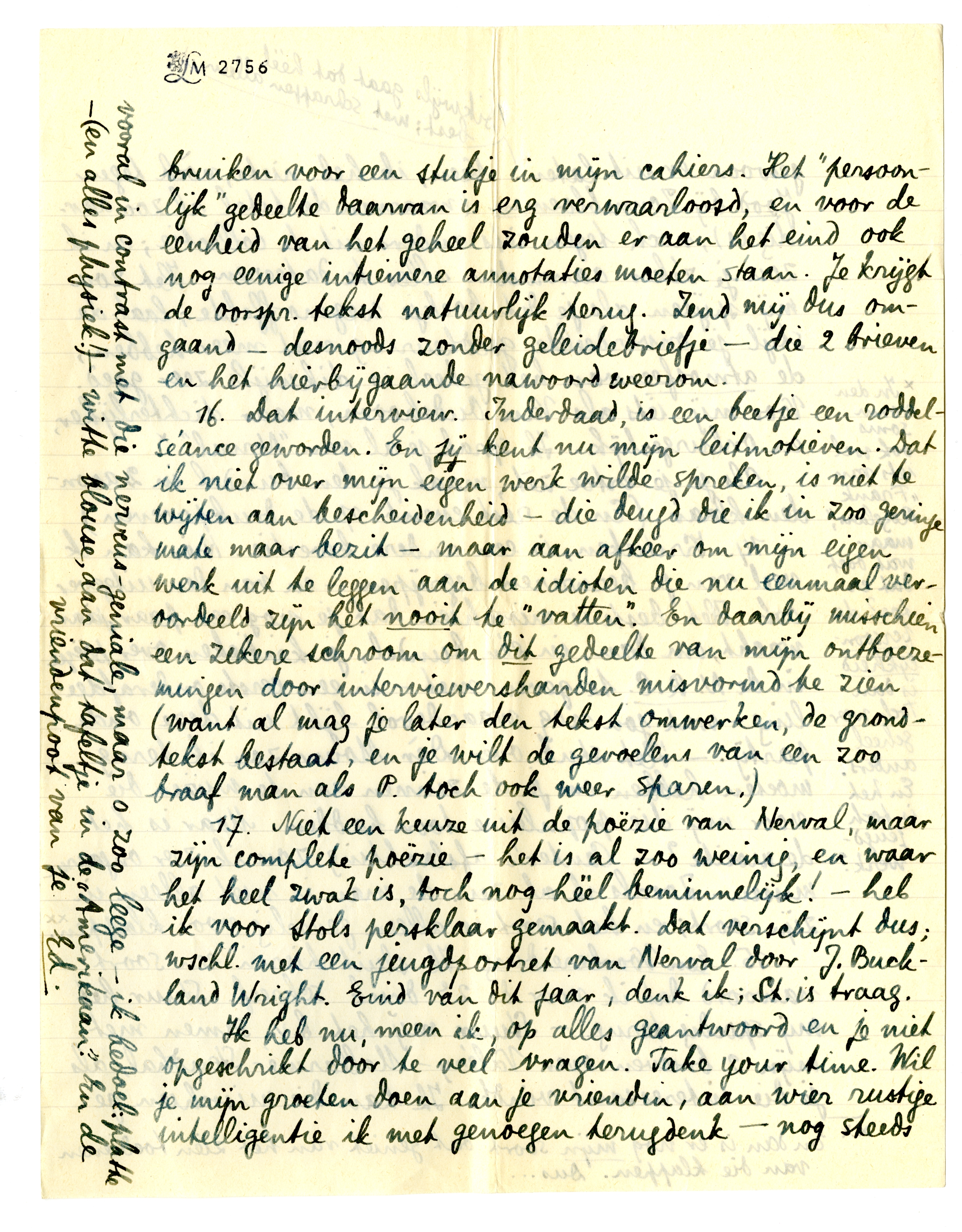 | 16. | Dat interview. Inderdaad, is een beetje een roddelséance geworden. En jij kent nu mijn leitmotieven. Dat ik niet over mijn eigen werk wilde spreken, is niet te wijten aan bescheidenheid - die deugd die ik in zoo geringe mate maar bezit - maar aan afkeer om mijn ei-gen werk uit te leggen aan de idioten die nu eenmaal veroordeeld zijn het nooit te ‘vatten’. En daarbij misschien een zekere schroom om dit gedeelte van mijn ontboezemingen door interviewershanden misvormd te zien (want al mag je later den tekst omwerken, de grondtekst bestaat, en je wilt de gevoelens van een zoo braaf man als P.1157 toch ook weer sparen.) |
