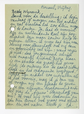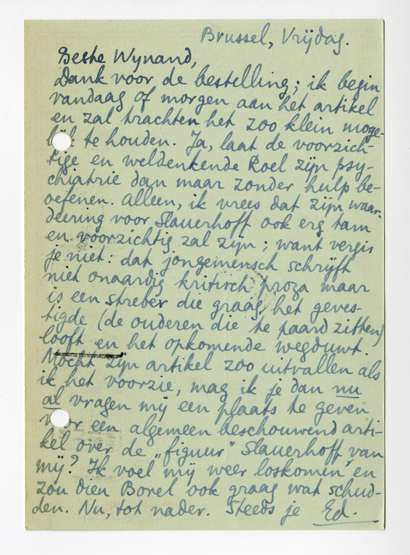 Dank voor de bestelling; ik begin vandaag of morgen aan het artikel1189 en zal trachten het zoo klein mogelijk te houden. Ja, laat de voorzichtige en weldenkende Roel zijn psychiatrie dan maar zonder hulp beoefenen. Alleen, ik vrees dat zijn waardeering voor Slauerhoff ook erg tam en voorzichtig zal zijn; want vergis je niet: dat jongemensch schrijft niet onaardig kritisch proza maar is een streber die graag het gevestigde (de ouderen die te paard zitten) looft en het opkomende wegduwt. Mocht zijn artikel zoo uitvallen als ik het voorzie, mag ik je dan nu al vragen mij een plaats te geven voor een algemeen beschouwend artikel over de ‘figuur’ Slauerhoff van mij? Ik voel mij weer loskomen en zou dien Borel ook graag wat schudden. Nu, tot nader. Steeds je