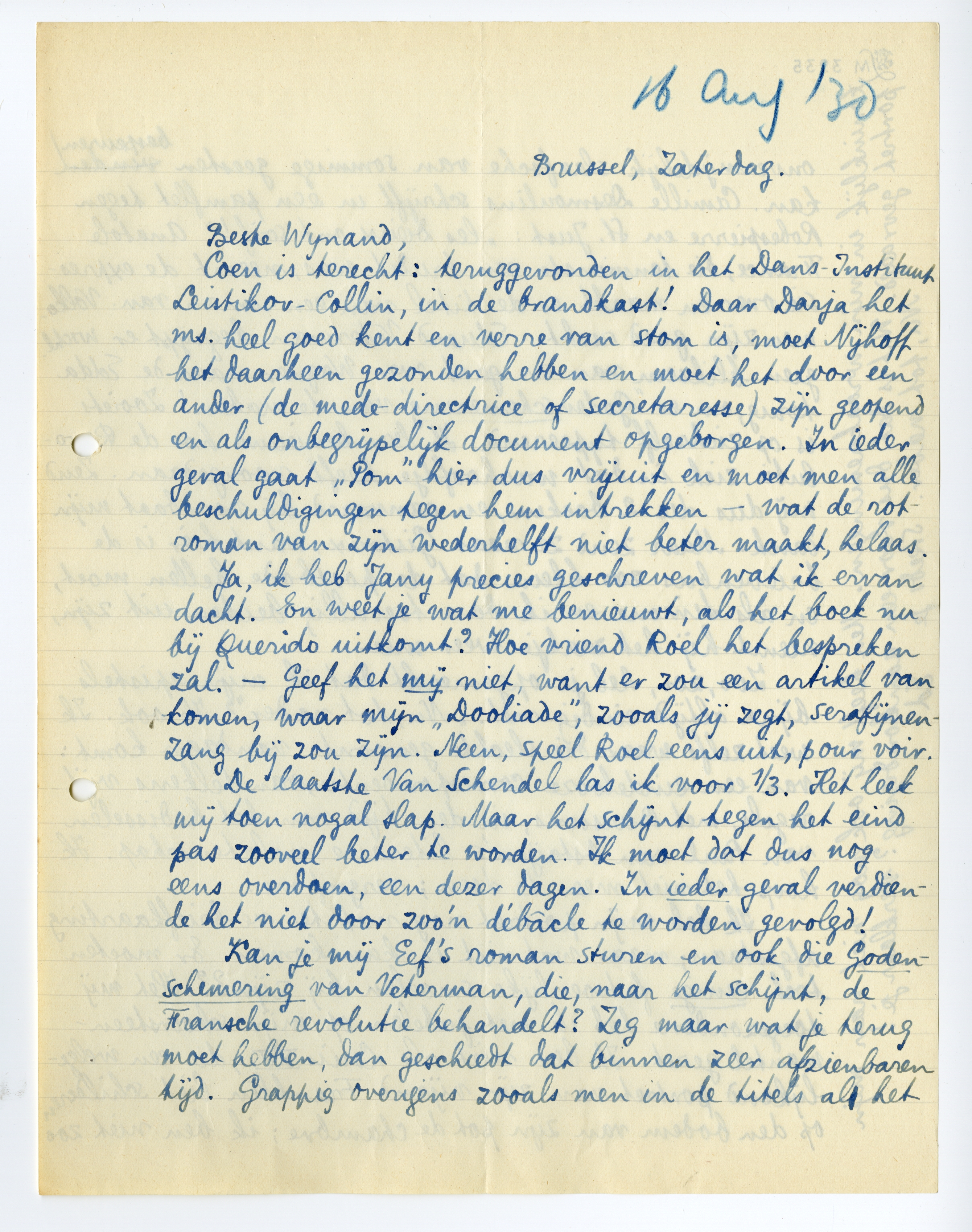 De laatste Van Schendel1214 las ik voor ⅓. Het leek mij toen nogal slap. Maar het schijnt tegen het eind pas zooveel beter te worden. Ik moet dat dus nog eens overdoen, een dezer dagen. In ieder geval verdiende het niet door zoo'n débâcle te worden gevolgd!