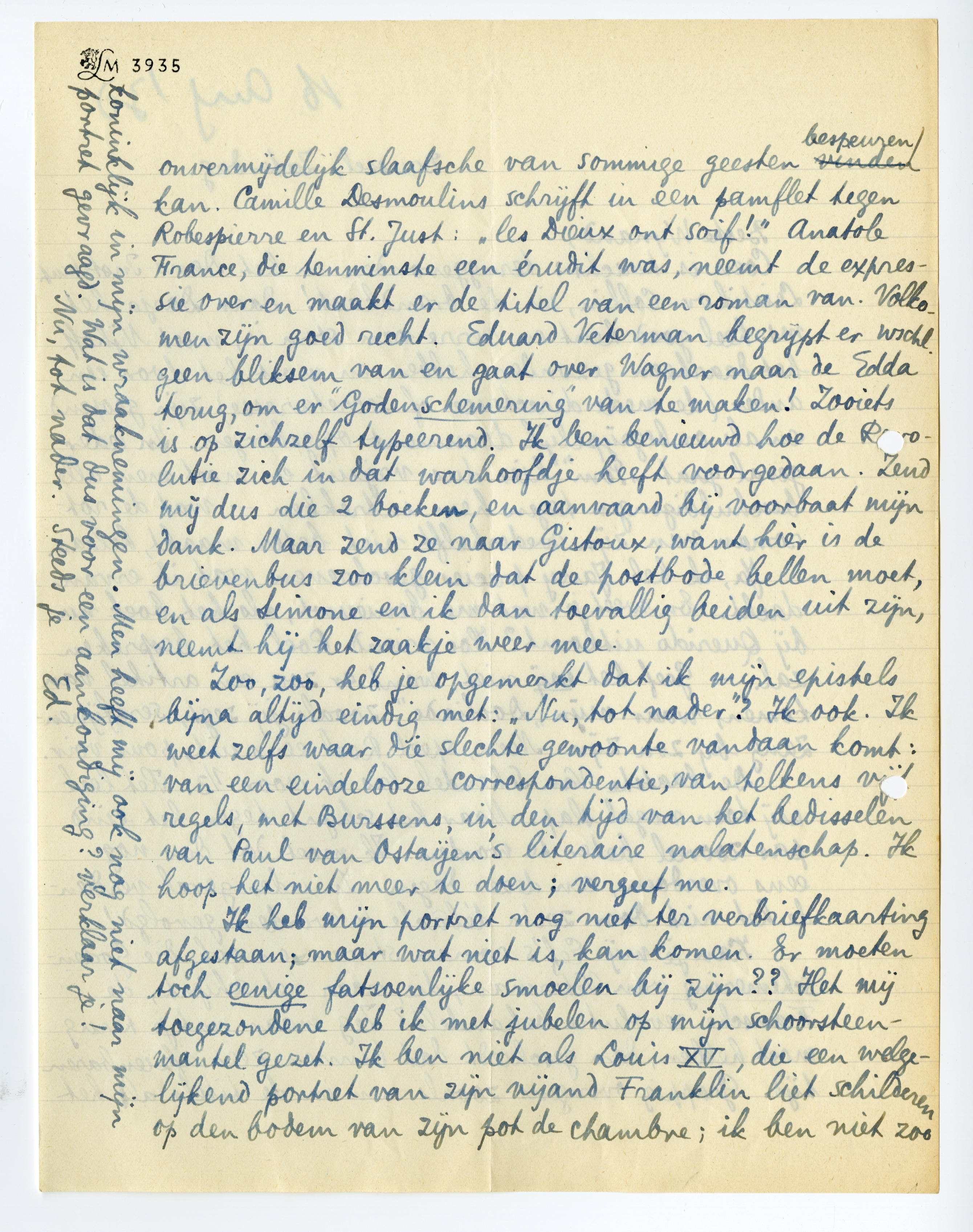 Kan je mij Eef's roman1215 sturen en ook die Godenschemering van Veterman, die, naar het schijnt, de Fransche revolutie behandelt? Zeg maar wat je terug moet hebben, dan geschiedt dat binnen zeer afzienbaren tijd. Grappig overigens zooals men in de titels al het onvermijdelijk slaafsche van sommige geesten bespeuren kan. Camille Desmoulins schrijft in een pamflet tegen Robespierre en St. Just: ‘les Dieux ont soif!’ Anatole France, die tenminste een érudit was, neemt de expressie over en maakt er de titel van een roman van. Volkomen zijn goed recht. Eduard Veterman begrijpt er wschl. geen bliksem van en gaat over Wagner naar de Edda terug, om er ‘Godenschemering’ van te maken! Zooiets is op zichzelf typeerend. Ik ben benieuwd hoe de Revolutie zich in dat warhoofdje heeft voorgedaan. Zend mij dus die 2 boeken, en aanvaard bij voorbaat mijn dank. Maar zend ze naar Gistoux, want hier is de brievenbus zoo klein dat de postbode bellen moet, en als Simone en ik dan toevallig beiden uit zijn, neemt hij het zaakje weer mee.