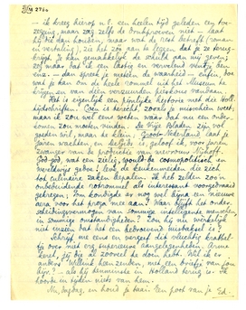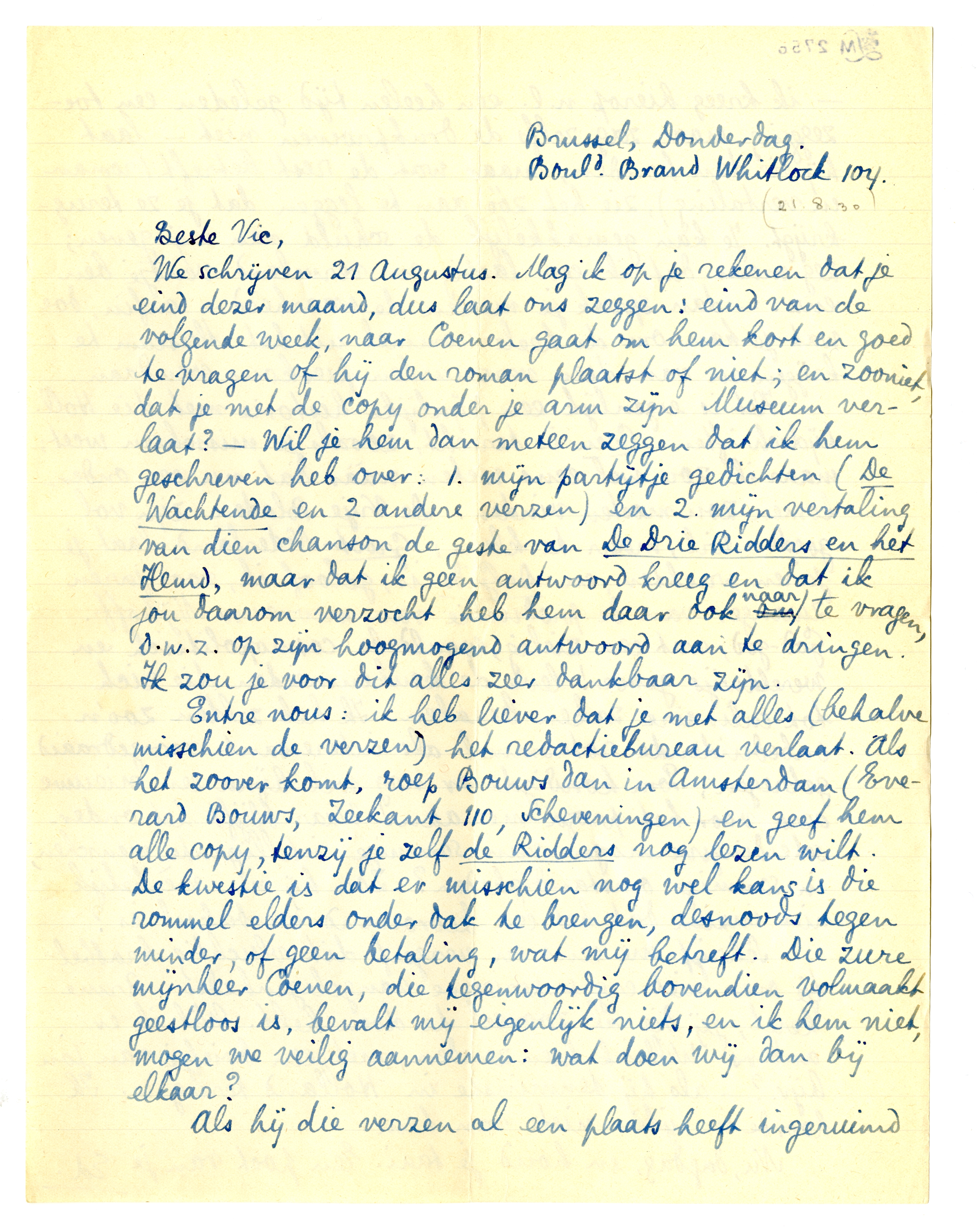 We schrijven 21 Augustus. Mag ik op je rekenen dat je eind dezer maand, dus laat ons zeggen: eind van de volgende week, naar Coenen gaat om hem kort en goed te vragen of hij den roman plaatst of niet; en zooniet, dat je met de copy onder je arm zijn Museum verlaat? - Wil je hem dan meteen zeggen dat ik hem geschreven heb1216 over: 1. mijn partijtje gedichten (De Wachtende en 2 andere verzen1217) en 2. mijn vertaling van dien chanson de geste van De Drie Ridders en het Hemd,1218 maar dat ik geen antwoord kreeg en dat ik jou daarom verzocht heb hem daar ook naar te vragen, d.w.z. op zijn hoogmogend antwoord aan te dringen. Ik zou je voor dit alles zeer dankbaar zijn.