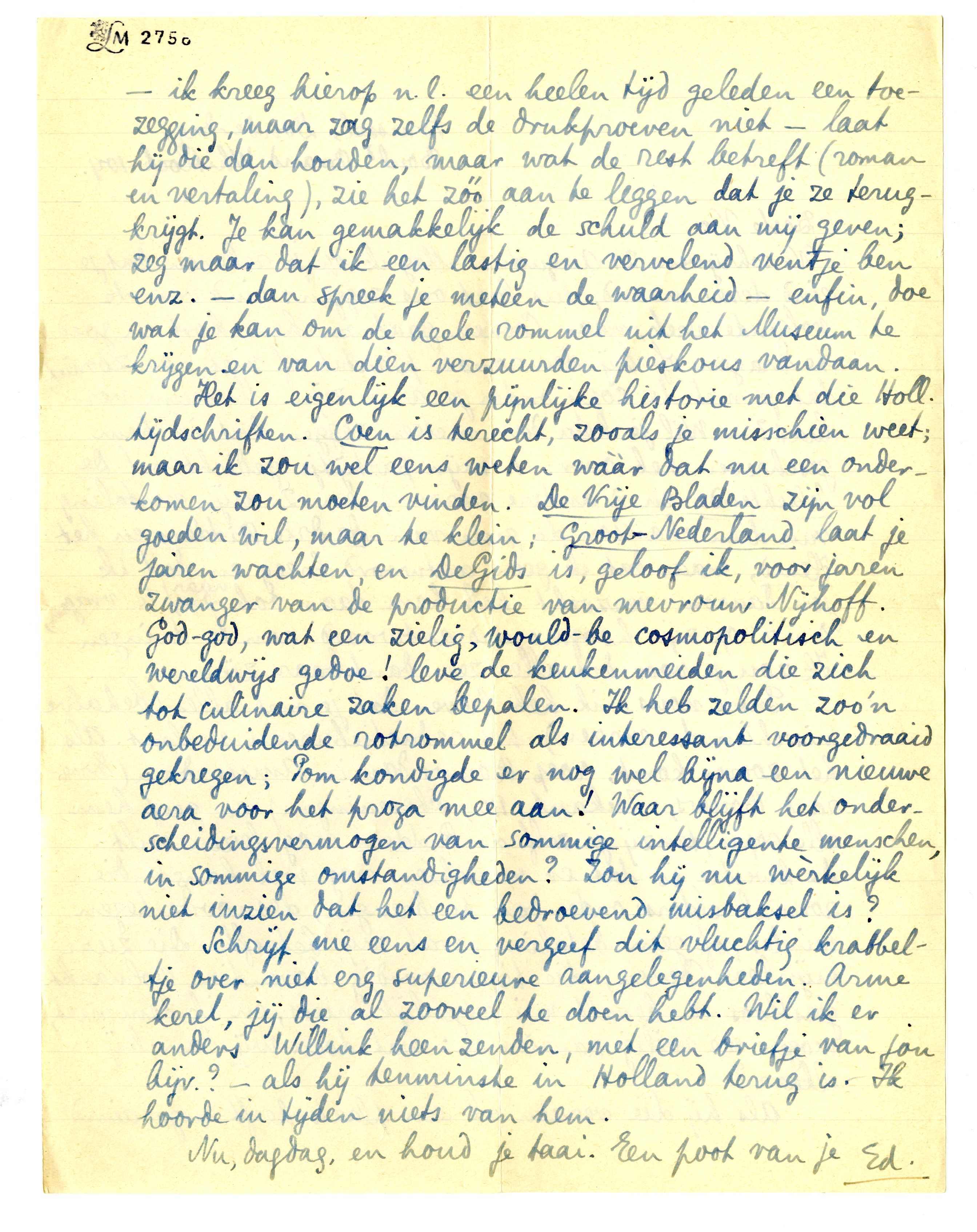 Als hij die verzen al een plaats heeft ingeruimd - ik kreeg hierop n.l. een heelen tijd geleden een toezegging, maar zag zelfs de drukproeven niet - laat hij die dan houden, maar wat de rest betreft (roman en vertaling), zie het zóó aan te leggen dat je ze terugkrijgt. Je kan gemakkelijk de schuld aan mij geven; zeg maar dat ik een lastig en vervelend ventje ben enz. - dan spreek je meteen de waarheid - enfin, doe wat je kan om de heele rommel uit het Museum te krijgen en van dien verzuurden pieskous vandaan.