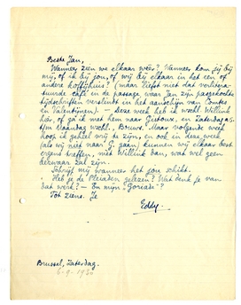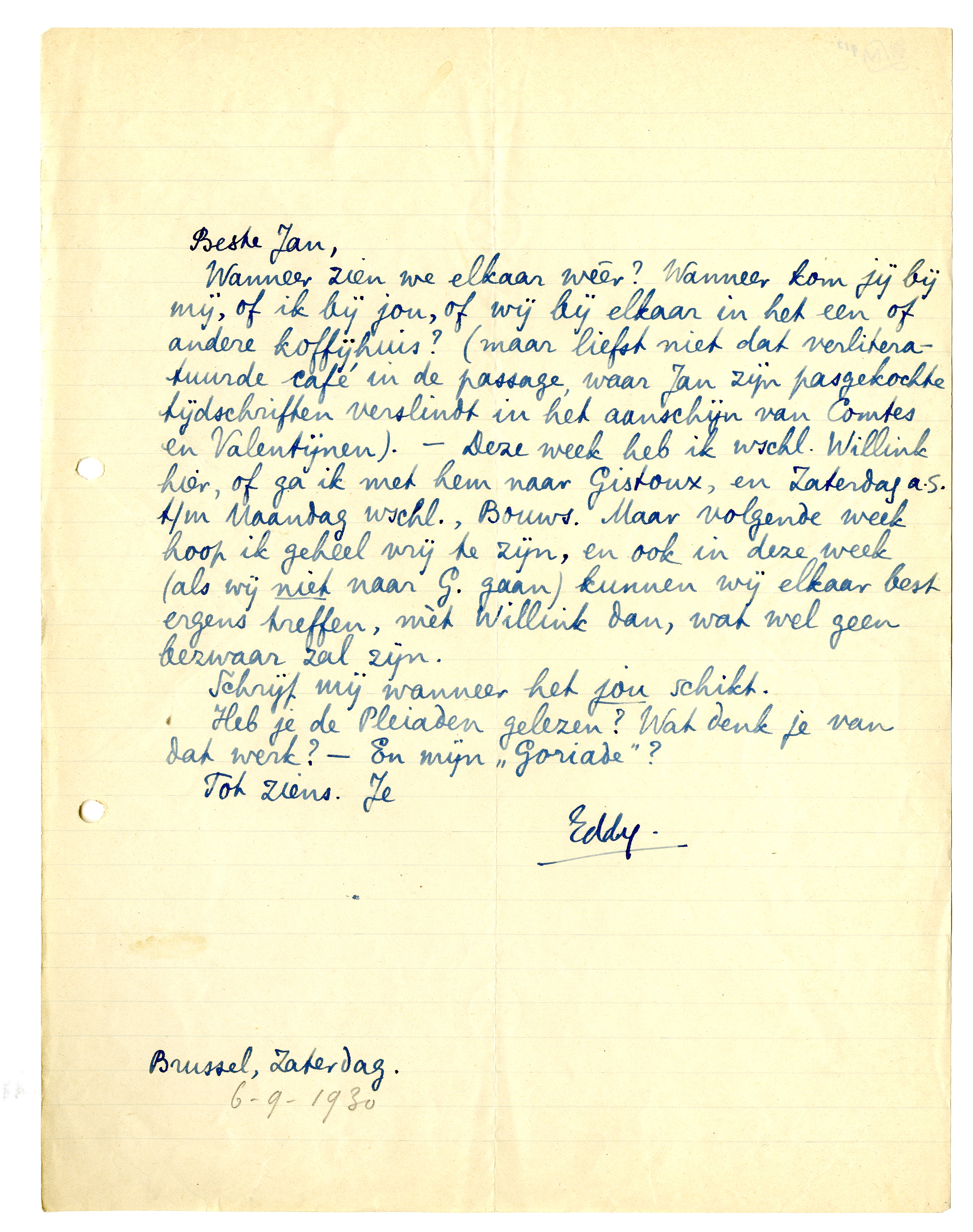 Wanneer zien we elkaar weêr? Wanneer kom jij bij mij, of ik bij jou, of wij bij elkaar in het een of andere koffijhuis? (maar liefst niet dat verliteratuurde café in de passage,1226 waar Jan zijn pasgekochte tijdschriften verslindt in het aanschijn van Comtes en Valentijnen1227). - Deze week heb ik wschl. Willink hier, of ga ik met hem naar Gistoux, en Zaterdag a.s. t/m Maandag wschl., Bouws. Maar volgende week hoop ik geheel vrij te zijn, en ook in deze week (als wij niet naar G. gaan) kunnen wij elkaar best ergens treffen, mèt Willink dan, wat wel geen bezwaar zal zijn.