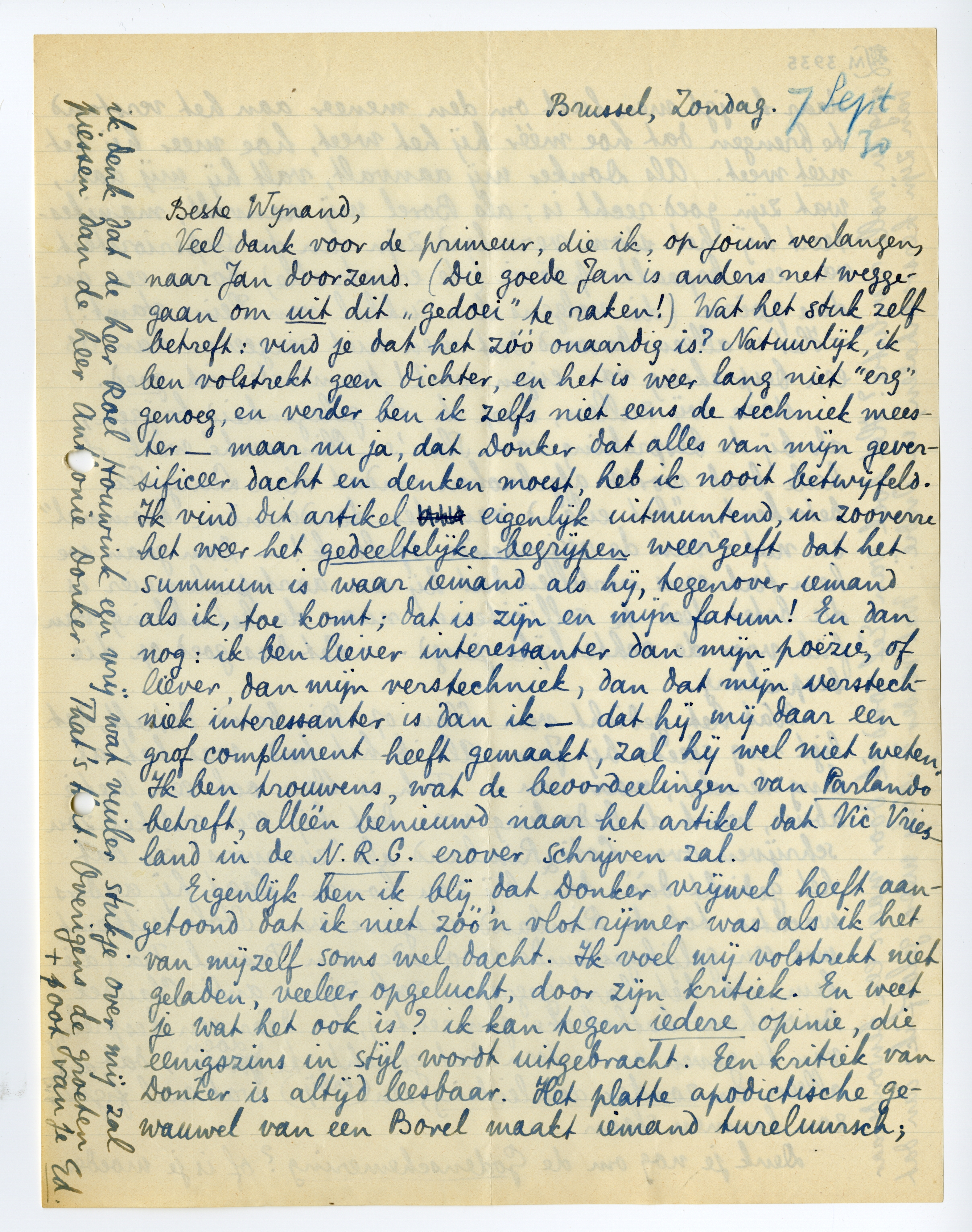 Veel dank voor de primeur,1229 die ik, op jouw verlangen, naar Jan doorzend. (Die goede Jan is anders net weggegaan om uit dit ‘gedoei’ te raken!) Wat het stuk zelf betreft: vind je dat het zóó onaardig is? Natuurlijk, ik ben voslstrekt geen dichter, en het is weer lang niet ‘erg’ genoeg, en verder ben ik zelfs niet eens de techniek meester - maar nu ja, dat Donker dat alles van mijn geversificeer dacht en denken moest, heb ik nooit betwijfeld. Ik vind dit artikel eigenlijk uitmuntend, in zooverre het weer het gedeeltelijke begrijpen weergeeft dat het summum is waar iemand als hij, tegenover iemand als ik, toe komt; dat is zijn en mijn fatum! En dan nog: ik ben liever interessanter dan mijn poëzie, of liever, dan mijn verstechniek, dan dat mijn verstechniek interessanter is dan ik - dat hij mij daar een grof compliment heeft gemaakt, zal hij wel niet weten. Ik ben trouwens, wat de beoordeelingen van Parlando betreft, alléén benieuwd naar het artikel dat Vic Vriesland in de N.R.C. erover schrijven zal.