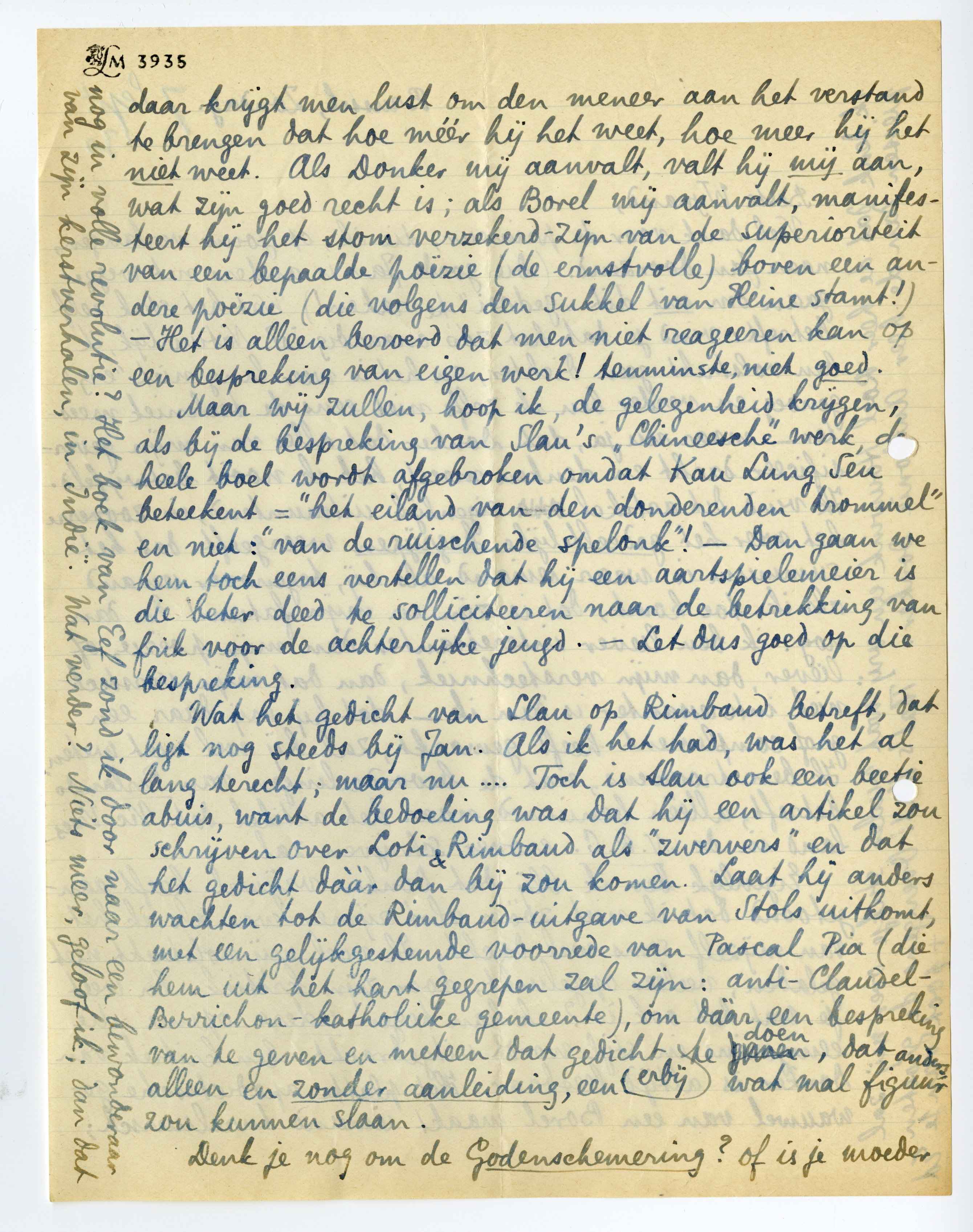 Wat het gedicht van Slau op Rimbaud betreft, dat ligt nog steeds bij Jan. Als ik het had, was het al lang terecht; maar nu.... Toch is Slau ook een beetje abuis, want de bedoeling was dat hij een artikel zou schrijven over Loti & Rimbaud als ‘zwervers’ en dat het gedicht dààr dan bij zou komen. Laat hij anders wachten tot de Rimbaud-uitgave van Stols uitkomt, met een gelijkgestemde voorrede van Pascal Pia (die hem uit het hart gegrepen zal zijn: anti-Claudel-Berrichon-katholieke gemeente), om dààr een bespreking van te geven en meteen dat gedicht erbij te doen, dat anders, alleen en zonder aanleiding, een wat mal figuur zou kunnen slaan.1230