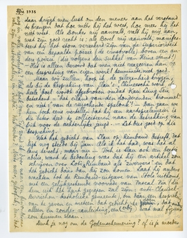 Eigenlijk ben ik blij dat Donker vrijwel heeft aangetoond dat ik niet zóó'n vlot rijmer was als ik het van mijzelf soms wel dacht. Ik voel mij volstrekt niet geladen, veeleer opgelucht, door zijn kritiek. En weet je wat het ook is? ik kan tegen iedere opinie, die eenigszins in stijl wordt uitgebracht. Een kritiek van Donker is altijd leesbaar. Het platte apodictische gewauwel van een Borel maakt iemand tureluursch; daar krijgt men lust om den meneer aan het verstand te brengen dat hoe méér hij het weet, hoe meer hij het niet weet. Als Donker mij aanvalt, valt hij mij aan, wat zijn goed recht is; als Borel mij aanvalt, manifesteert hij het stom verzekerd-zijn van de superioriteit van een bepaalde poëzie (de ernstvolle) boven een andere poëzie (die volgens den sukkel van Heine stamt!) - Het is alleen beroerd dat men niet reageeren kan op een bespreking van eigen werk! tenminste, niet goed.