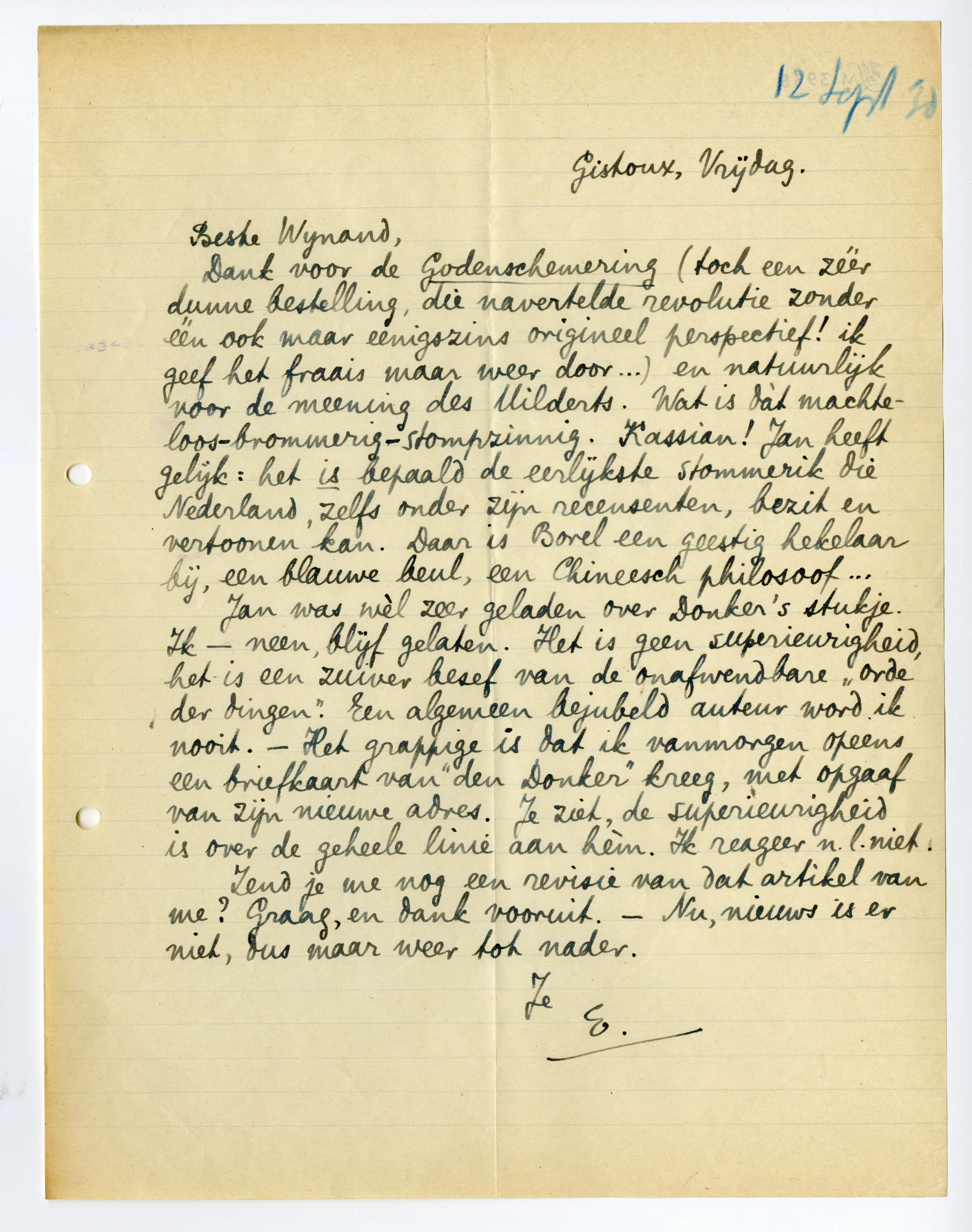 Dank voor de Godenschemering (toch een zéér dunne bestelling, die navertelde revolutie zonder één ook maar eenigszins origineel perspectief! ik geef het fraais maar weer door...) en natuurlijk voor de meening des Uilderts.1240 Wat is dàt machteloos-brommerigstompzinnig. Kassian! Jan heeft gelijk: het is bepaald de eerlijkste stommerik die Nederland, zelfs onder zijn recensenten, bezit en vertoonen kan. Daar is Borel een geestig hekelaar bij, een blauwe beul, een Chineesch philosoof...