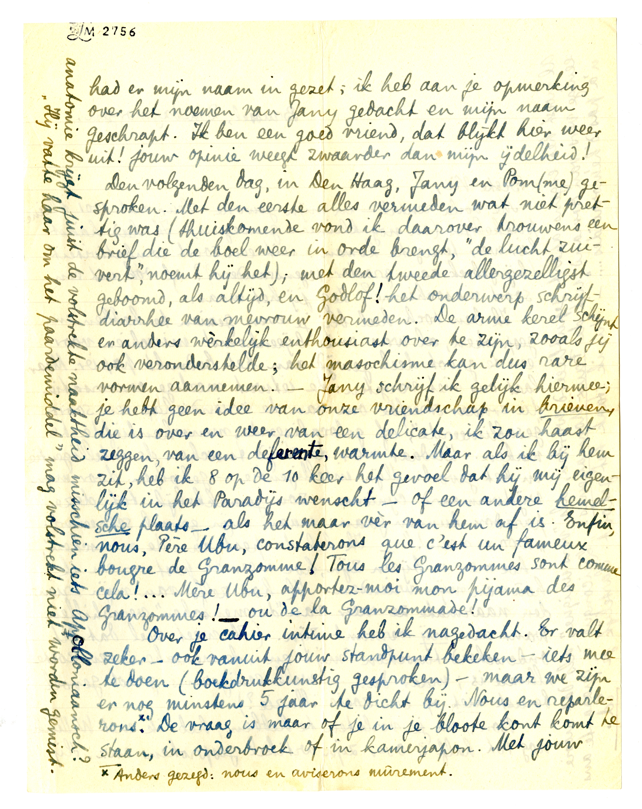Den volgenden dag, in Den Haag, Jany en Pom(me) gesproken. Met den eerste alles vermeden wat niet prettig was (thuiskomende vond ik daarover trouwens een brief die de boel weer in orde brengt, ‘de lucht zuivert’, noemt hij het); met den tweede allergezelligst geboomd, als altijd, en Godlof! het onderwerp schrijfdiarrhee van mevrouw vermeden. De arme kerel schijnt er anders wèrkelijk enthousiast over te zijn, zooals jij ook veronderstelde; het masochisme kan dus rare vormen aannemen. - Jany schrijf ik gelijk hiermee; je hebt geen idee van onze vriendschap in brieven, die is over en weer van een delicate, ik zou haast zeggen, van een deferente, warmte. Maar als ik bij hem zit, heb ik 8 op de 10 keer het gevoel dat hij mij eigenlijk in het Paradijs wenscht - of een andere hemelsche plaats - als het maar vèr van hem af is. Enfin, nous, Père Ubu, constaterons que c'est un fameux bougre de Granzomme! Tous les Granzommes sont comme cela!... Mère Ubu, apportez-moi mon pijama des Granzommes! - ou de la Granzommade!