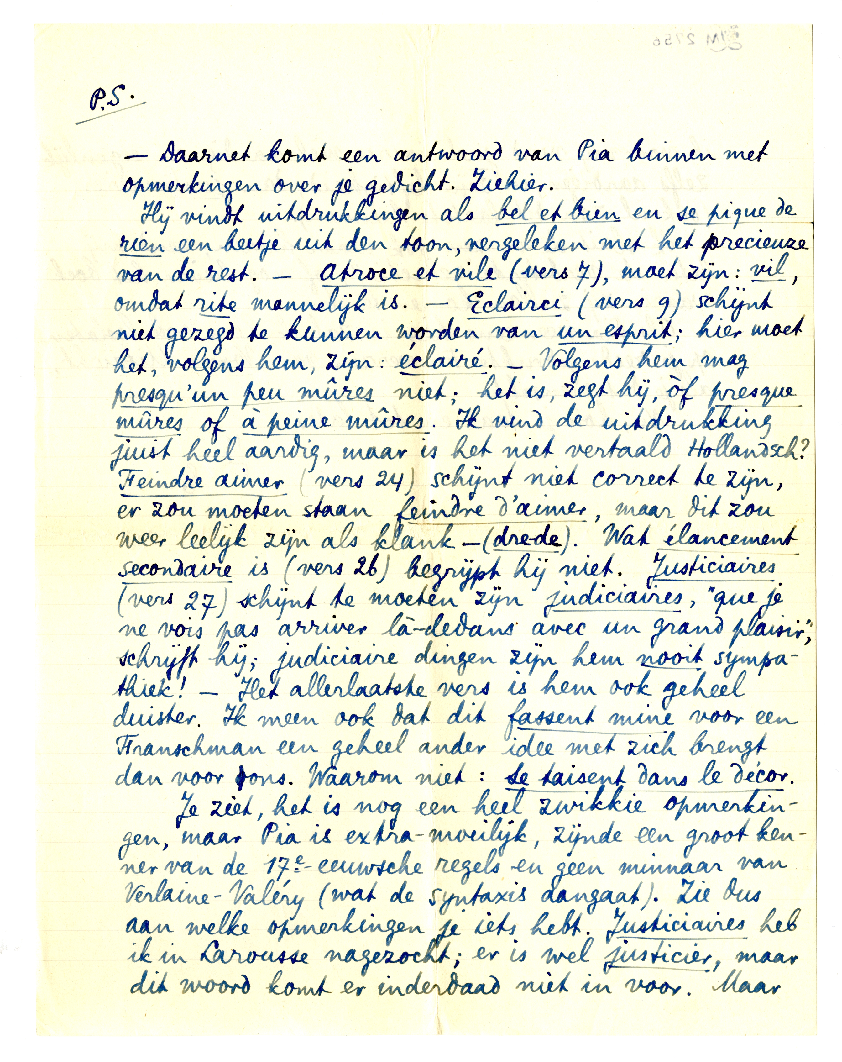 Je ziet, het is nog een heel zwikkie opmerkingen, maar Pia is extramoeilijk, zijnde een groot kenner van de 17e-eeuwsche regels en geen minnaar van Verlaine-Valéry (wat de syntaxis aangaat). Zie dus aan welke opmerkingen je iets heb. Justiciaires heb ik in Larousse nagezocht; er is wel justicier, maar dit woord komt er inderdaad niet in voor. Maar ik voor mij vind judiciaires wèl aardig, en eigenlijk zelfs aardiger, in zijn deftigheid, dan justiciaires (ook al zou dit laatste kunnen).