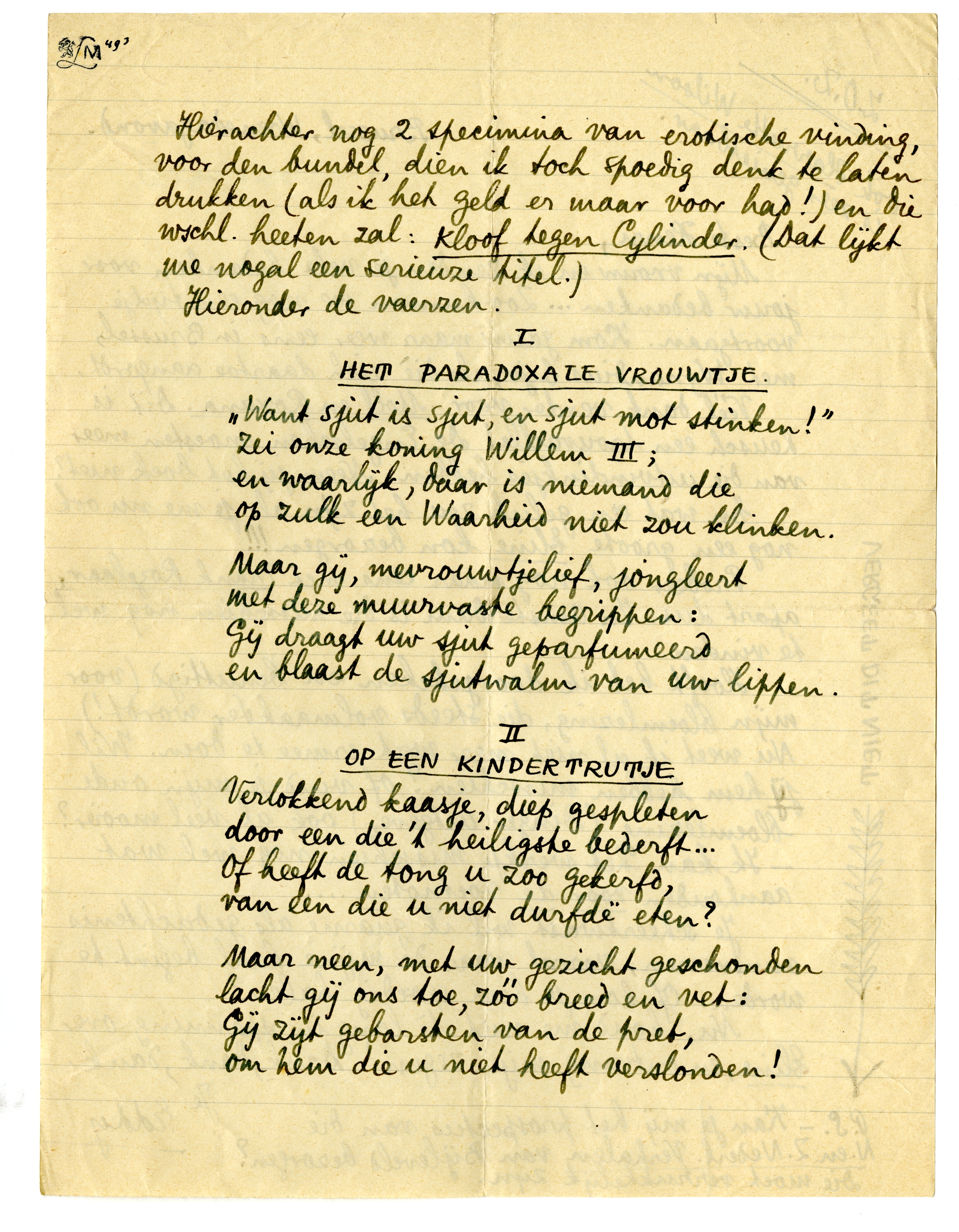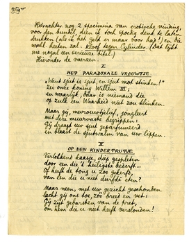 Hierachter nog 2 specimina van erotische vinding, voor den bundel, dien ik toch spoedig denk te laten drukken (als ik het geld er maar voor had!) en die wschl. heeten zal: Kloof tegen Cylinder.1266 (Dat lijkt me nogal een serieuze titel.)