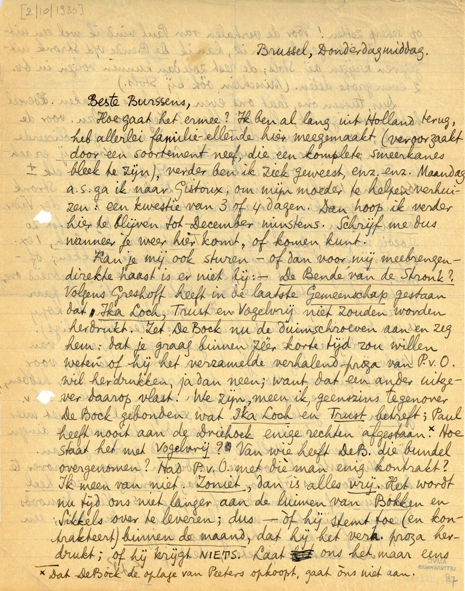 Kan je mij ook sturen - of dan voor mij meebrengen - direkte haast is er niet bij: - De Bende van de Stronk? Volgens Greshoff heeft in de laatste Gemeenschap gestaan dat Ika Loch, Trust en Vogelvrij niet zouden worden herdrukt.1268 Zet De Bock nu de duimschroeven aan en zeg hem: dat je graag binnen zéér korte tijd zou willen weten of hij het verzamelde verhalend proza van P.v.O. wil herdrukken, ja dan neen; want dat een ander uitgever daarop vlast. We zijn, meen ik, geenszins tegenover De Bock gebonden wat Ika Loch en Trust be-treft; Paul heeft nooit aan de Driehoek enige rechten afgestaan.* Hoe staat het met Vogelvrij? Van wie heeft De B. die bundel overgenomen? Had P.v.O met diè man enig kontrakt? Ik meen van niet. Zoniet, dan is alles vrij. Het wordt nu tijd ons niet langer aan de luimen van Bokken-en Sikkels over te leveren; dus - òf hij stemt toe (en kontrakteert) binnen de maand, dat hij het verh. proza herdrukt; of hij krijgt NIETS. Laat ons het maar eens op scherp zetten! Voor de verhalen van Paul vind ik wel een uitgever. In ieder geval, meen ik, kan ik De Bende v/d Stronk uitgegeven krijgen bij Stols; de rest zou dan kunnen volgen in bv. 2 even grote delen. (Misschien óók bij Stols.)