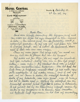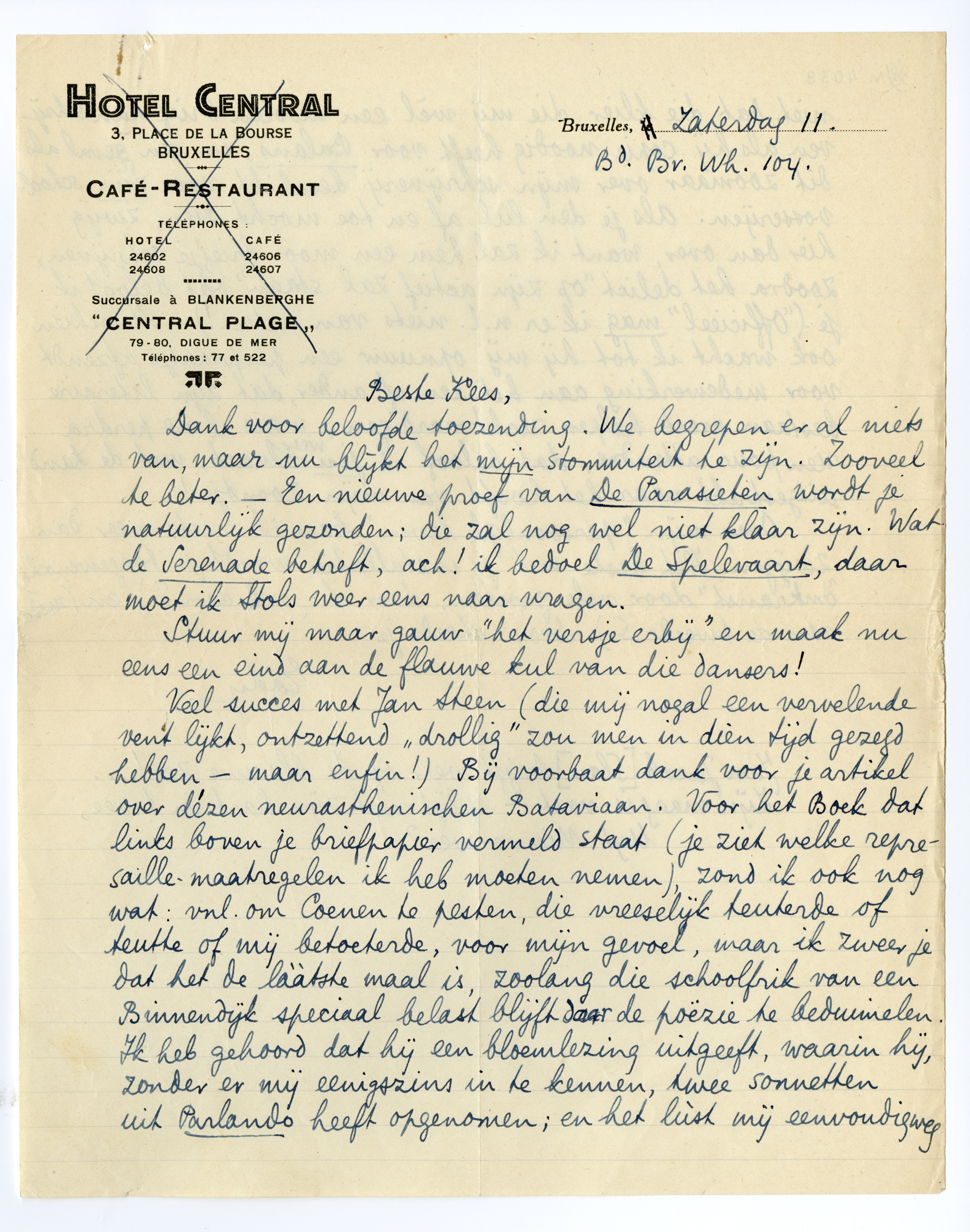 Veel succes met Jan Steen1275 (die mij nogal een vervelende vent lijkt, ontzettend ‘drollig’ zou men in dien tijd gezegd hebben - maar enfin!) Bij voorbaat dank voor je artikel over dézen neurasthenischen Bataviaan.1276 Voor het Boek dat links boven je briefpapier vermeld staat1277 (je ziet welke represaille-maatregelen ik heb moeten nemen), zond ik ook nog wat: vnl. om Coenen te pesten, die vreeselijk teuterde of teutte of mij betoeterde, voor mijn gevoel, maar ik zweer je dat het de láátste maal is, zoolang die schoolfrik van een Binnendijk speciaal belast blijft daar de poëzie te beduimelen. Ik heb gehoord dat hij een bloemlezing uitgeeft, waarin hij, zonder er mij eenigszins in te kennen, twee sonnetten uit Parlando heeft opgenomen1278; en het lùst mij eenvoudigweg niet dat die klier, die mij wél een mooien brief kan schrijven als hij copie noodig heeft voor Balans, in een geval als dit zoomaar over mijn schrijverij beschikt voor zijn schoolvosserijen. Als je den lui af en toe mocht zien, zwijg hier dan over, want ik zal hem een mooi briefje schrijven, zoodra het delict ‘op zijn actief zal staan’, dat beloof ik je. (‘Officieel’ mag ik er n.l. niets van weten!) - Misschien ook wacht ik tot hij mij opnieuw een pispraatje afzendt voor medewerking aan het een of ander, dat zijn literaire bestaan moet helpen rechtvaardigen; mais il ne perdra rien pour attendre, dat beloof ik jou weer alvast, met de hand uitgestrekt naar het hoofd van mijn zoontje!