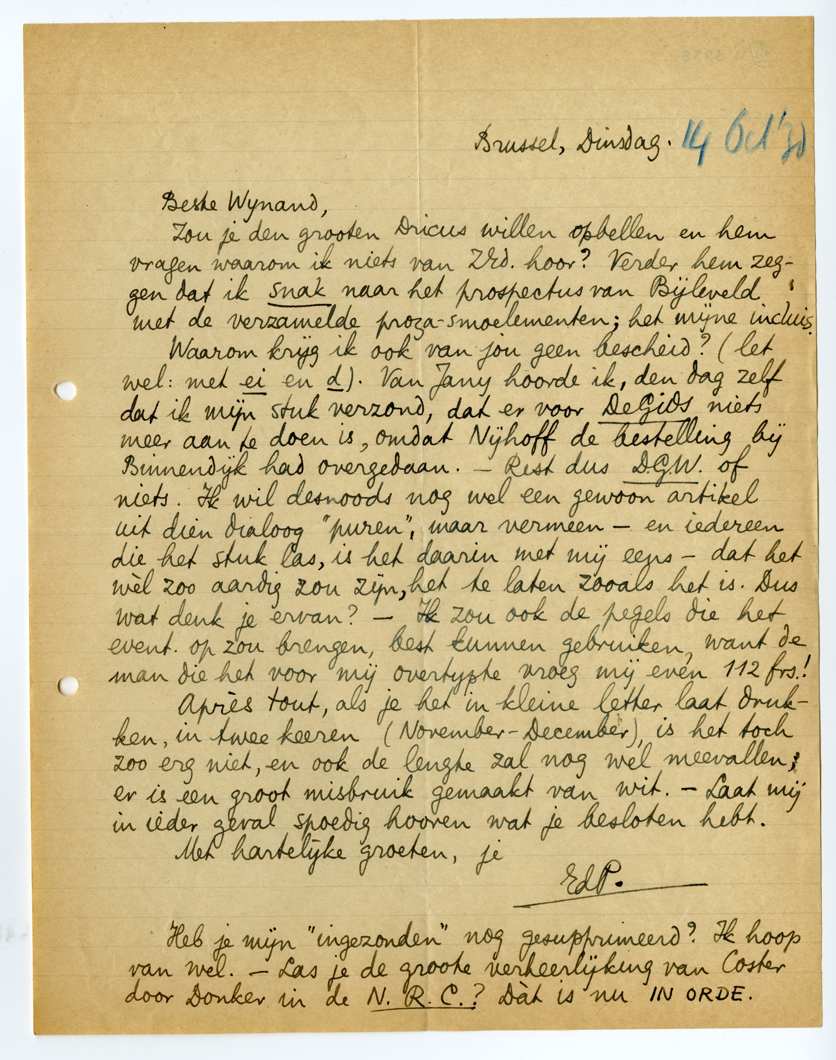 Waarom krijg ik van jou geen bescheid? (let wel: met ei en d). Van Jany hoorde ik, den dag zelf dat ik mijn stuk verzond, dat er voor De Gids niets meer aan te doen is, omdat Nijhoff de bestelling bij Binnendijk had overgedaan. - Rest dus D.G.W. of niets. Ik wil desnoods nog wel een gewoon artikel uit dien dialoog ‘puren’, maar vermeen - en iedereen die het stuk las, is het daarin met mij eens - dat het wèl zoo aardig zou zijn, het te laten zooals het is. Dus wat denk je ervan? - Ik zou ook de pegels die het event, op zou brengen, best kunnen gebruiken, want de man die het voor mij overtypte vroeg mij even 112 frs!