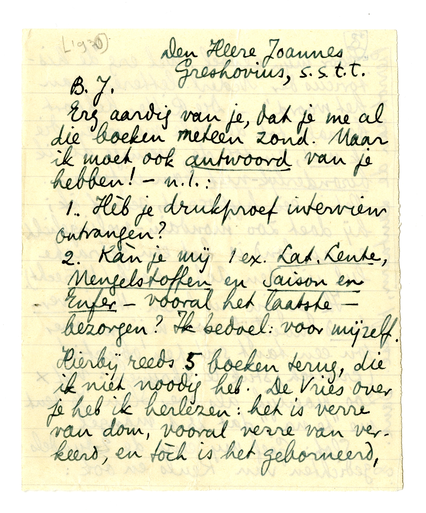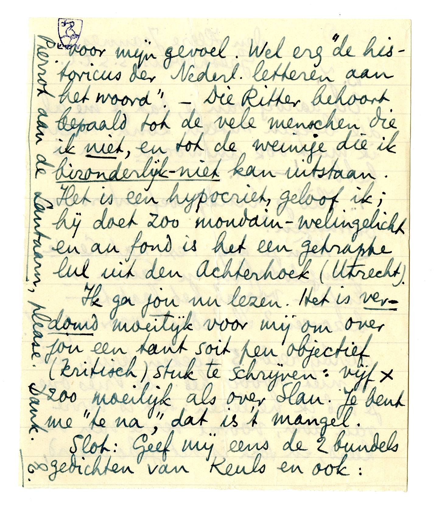 Hierbij reeds 5 boeken terug, die ik niet noodig heb. De Vries1291 over je heb ik herlezen: het is verre van dom, vooral verre van verkeerd, en tòch is het geborneerd, voor mijn gevoel. Wel erg ‘de historicus der Nederl. letteren aan het woord’. - Die Ritter behoort bepaald tot de vele menschen die ik niet, en tot de weinige die ik bizonderlijk-niet kan uitstaan. Het is een hypocriet, geloof ik; hij doet zoo mondain-welingelicht en au fond is het een getrapte lui uit den Achterhoek (Utrecht).