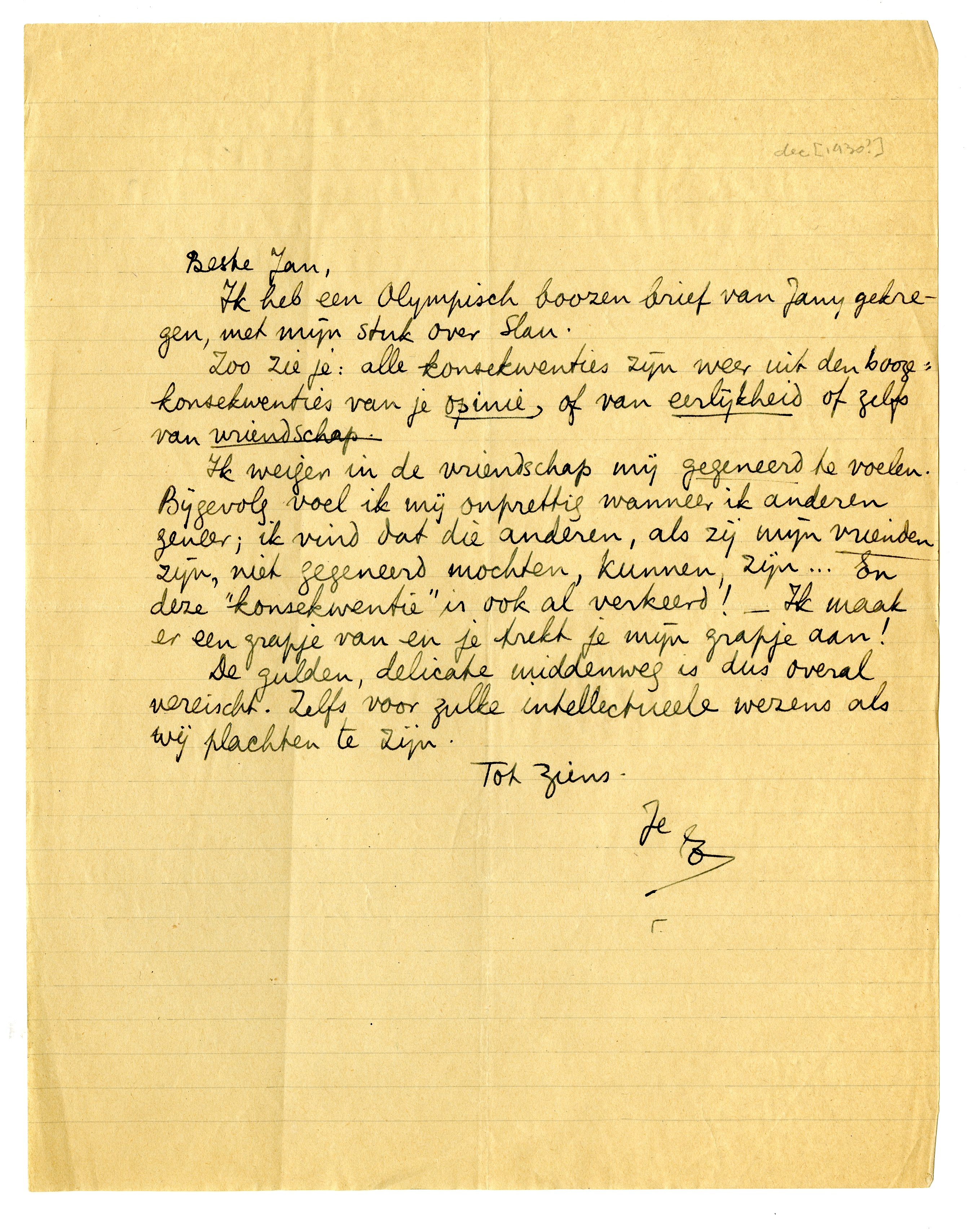 Ik weiger in de vriendschap mij gegeneerd te voelen. Bijgevolg voel ik mij onprettig wanneer ik anderen geneer; ik vind dat die anderen, als zij mijn vrienden zijn, niet gegeneerd mochten, kunnen, zijn... En deze ‘konsekwentie’ is ook al verkeerd! - Ik maak er een grapje van en je trekt je mijn grapje aan!