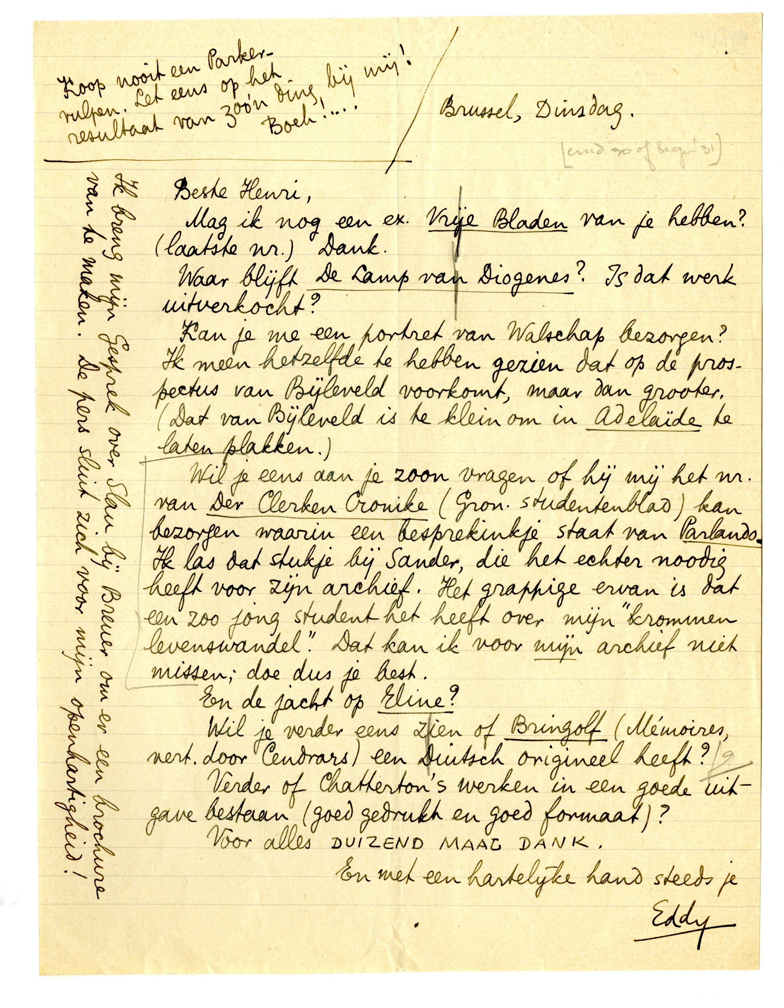 Wil je eens aan je zoon vragen of hij mij het nr. van Der Clercken Cronike1330 (Gron. studentenblad) kan bezorgen waarin een besprekinkje staat van Parlando. Ik las dat stukje bij Sander, die het echter noodig heeft voor zijn archief. Het grappige ervan is dat een zoo jong student het heeft over mijn ‘krommen levenswandel’. Dat kan ik voor mijn archief niet missen; doe dus je best.