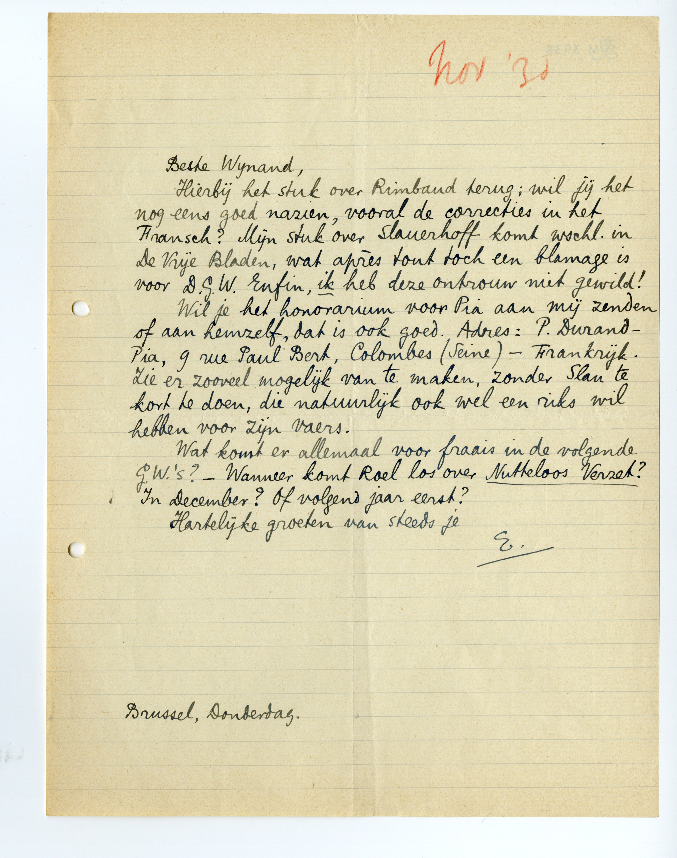 Hierbij het stuk over Rimbaud terug; wil jij het nog eens goed nazien, vooral de correcties in het Fransch? Mijn stuk over Slauerhoff komt wschl. in De Vrije Bladen, wat après tout toch een blamage is voor D.G.W. Enfin, ik heb deze ontrouw niet gewild!