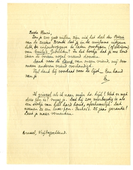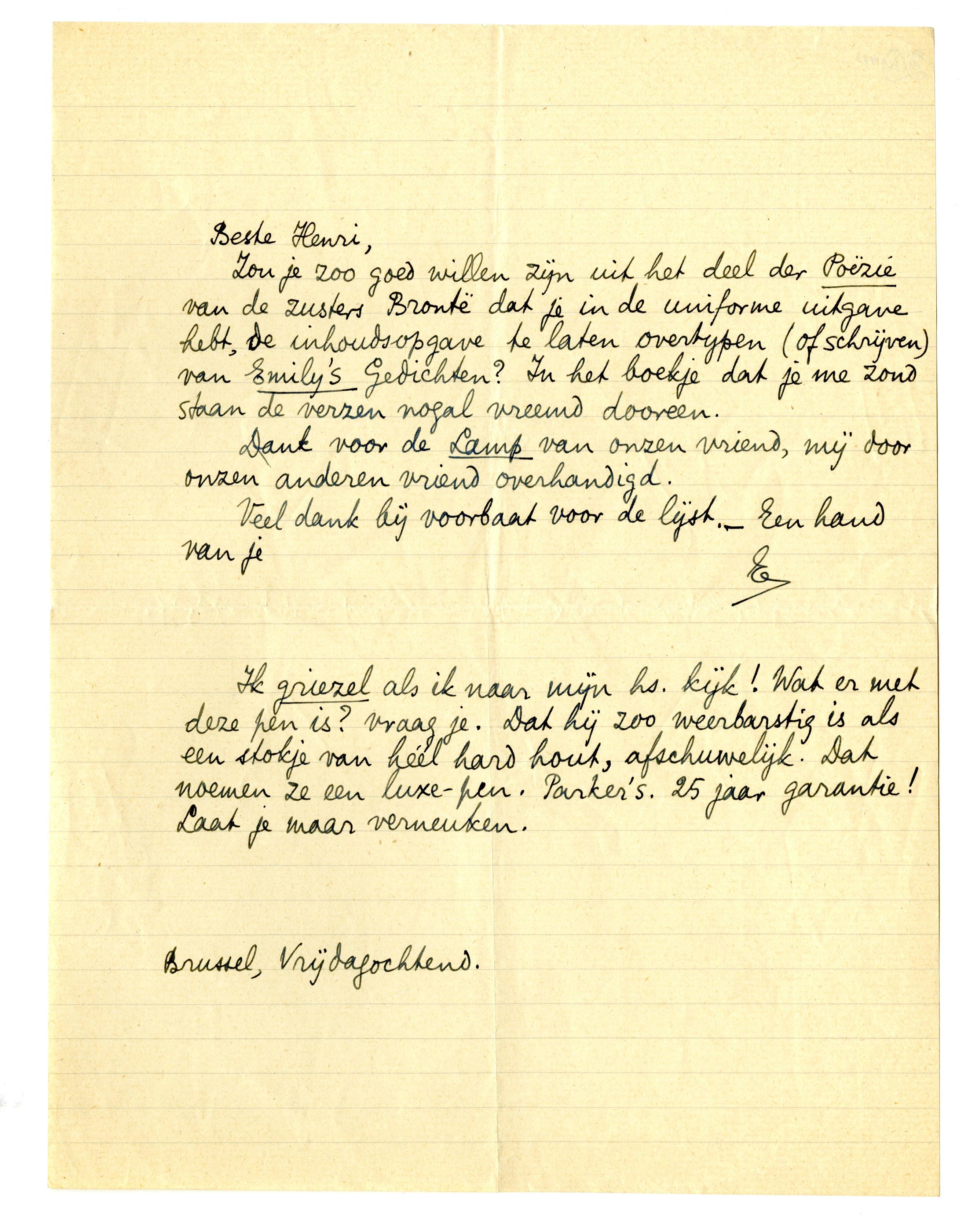 Ik griezel als ik naar mijn hs. kijk! Wat er met deze pen is? vraag je. Dat hij zoo weerbarstig is als een stokje van héél hard hout, afschuwelijk. Dat noemen ze een luxe-pen. Parker's. 25 jaar garantie! Laat je maar verneuken.