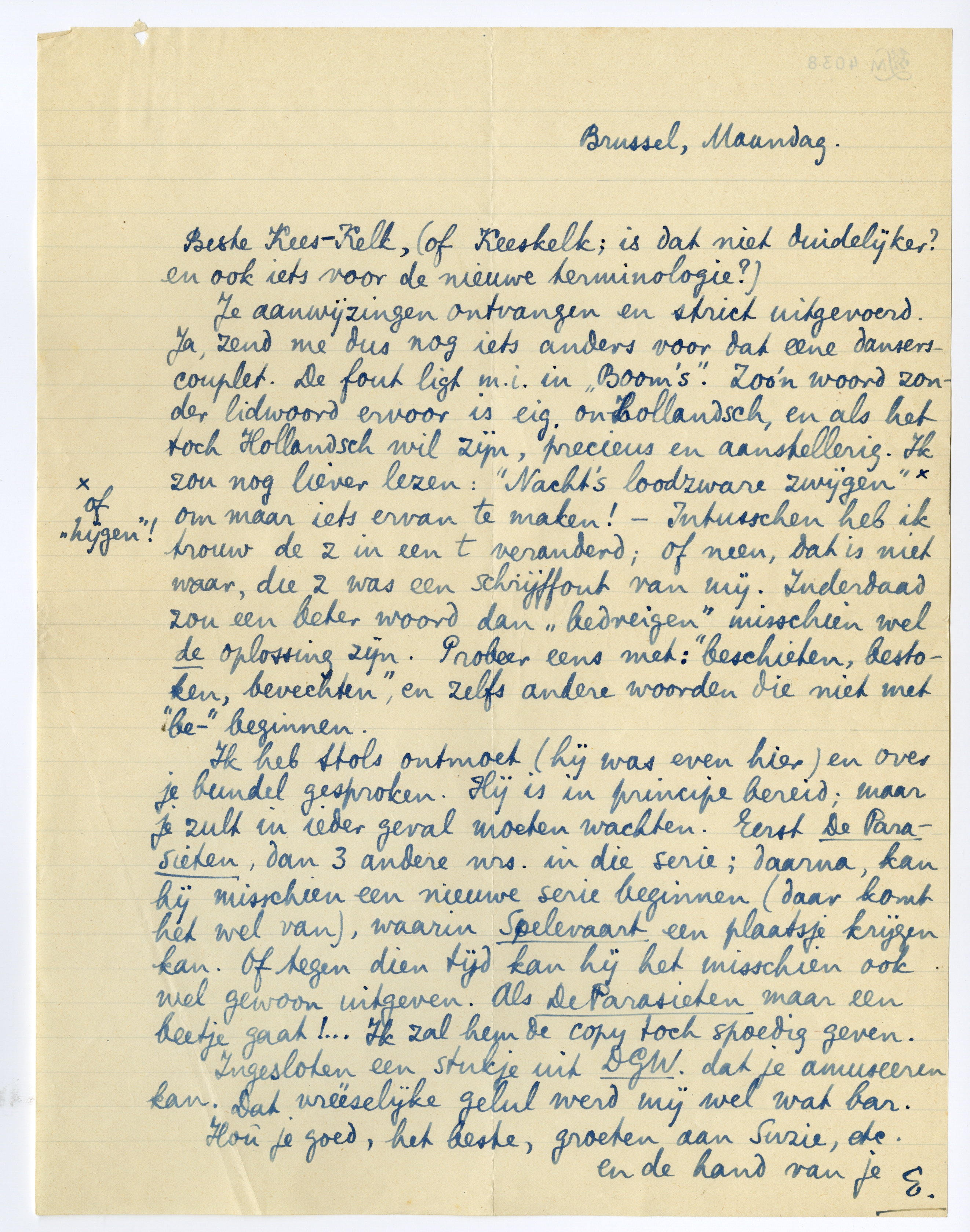 Ik heb Stols ontmoet (hij was even hier) en over je bundel gesproken. Hij is in principe bereid; maar je zult in ieder geval moeten wachten. Eerst De Parasieten, dan 3 andere nrs. in die serie; daarna, kan hij misschien een nieuwe serie beginnen (daar komt het wel van), waarin Spelevaart een plaatsje krijgen kan. Of tegen dien tijd kan hij het misschien ook wel gewoon uitgeven. Als De Parasieten maar een beetje gaat!... Ik zal hem de copy toch spoedig geven.